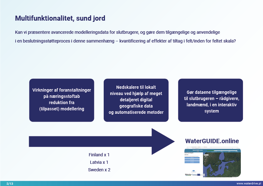 Det giver nem adgang til et væld af avancerede data fra for eksempel resultater af modellering af næringsstoftab, forudsigelser af jordegenskaber og fjernregistrerede topografiske data gennem en brugervenlig grænseflade i en webbrowser. WaterGUIDE er det første system af sin art, så vidt vi ved, hvor en bruger kan kombinere data med høj rumlig opløsning om både den modellerede effekt af forskellige afværgeforanstaltninger på tab af næringsstoffer, samt en vurdering af den økonomiske værdi eller omkostninger ved måle.