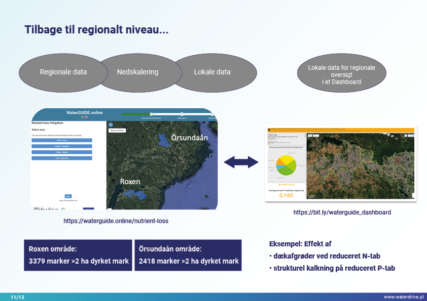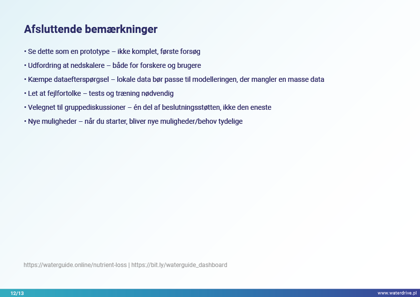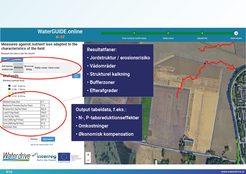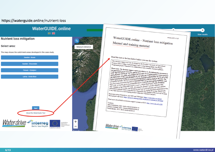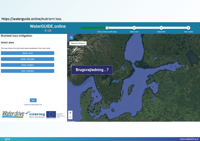 WaterGUIDE online (https://waterguide.online/nutrient-loss) er en første version af et interaktivt beslutningsstøttesystem (DSS) til optimering af valget af afbødende foranstaltninger (konstruerede vådområder, strukturel kalkning, bufferzoner og efterafgrøder), samt deres placeringer.