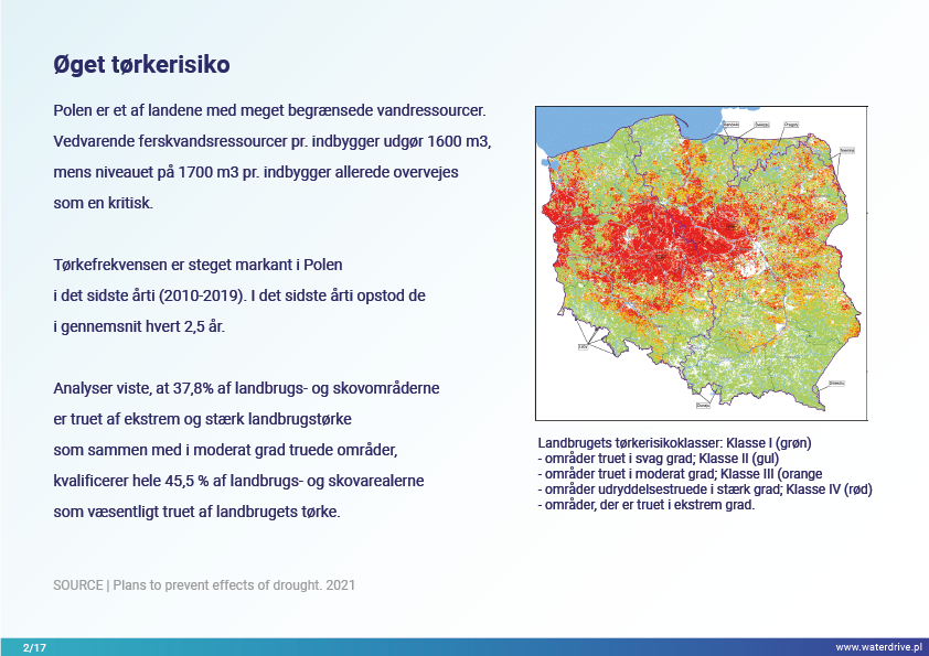 Området Kutno County er et vigtigt landbrugsproduktionsområde i Lodz-provinsen (Polen), som blev hårdt ramt af tørke i 2018 og 2019. Renovering af drænsystemet og overgang til et kontrolleret/dobbeltfunktionsdræningssystem er en væsentlig foranstaltning i kampen mod tørken.