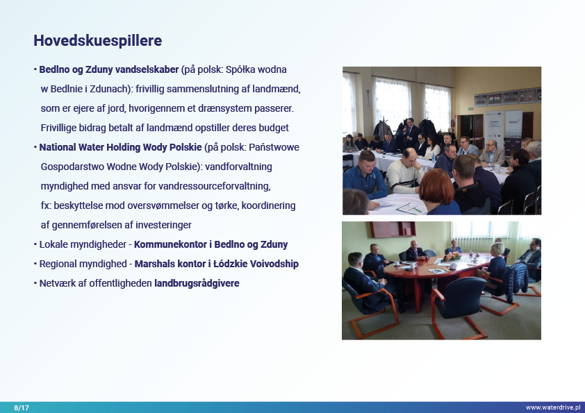 Vi præsenterer fremskridtene for lokalt samarbejde med flere interessenter for at øge vandretentionen, hvor hovedaktørerne er vandselskaberne (frivillig sammenslutning af landmænd) og National Water Holding Wody Polskie. Regionale og nationale initiativer har stærkt stimuleret lokale tiltag.