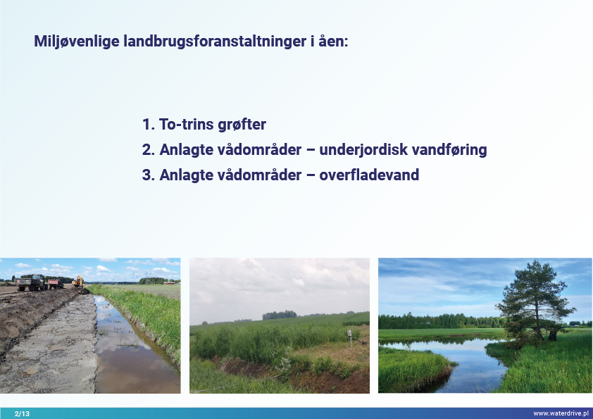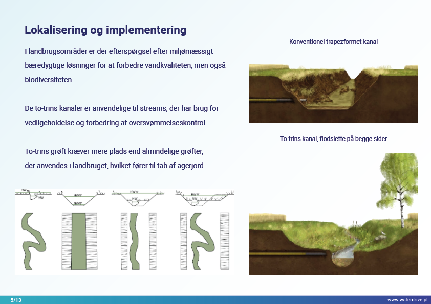 Den sidste gruppe af foranstaltninger, der præsenteres i Waterdrive Catalogue of Measures (https://www.slu.se/waterdrive) er landbrugsmiljøforanstaltninger, der er direkte relateret til akvatiske økosystemer: to-trins grøfter og konstruerede vådområder. Genopbygning af kanaler eller regulerede vandløb bestående af afgrænsning af hovedrenden og flodsletteterrasser tjener til beskyttelse mod oversvømmelser og tørke, selvrensning af floder og øget biodiversitet.