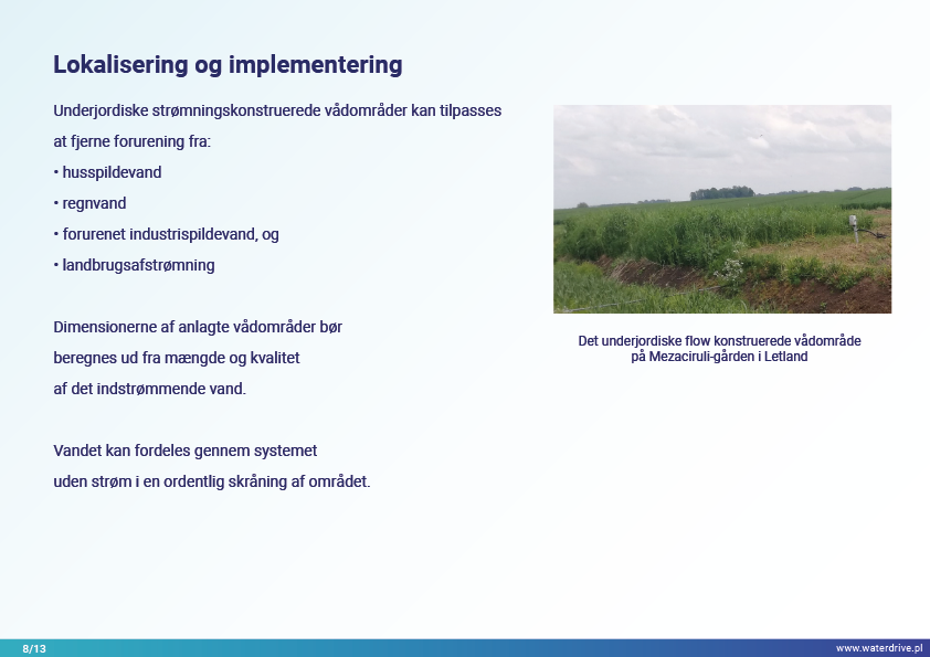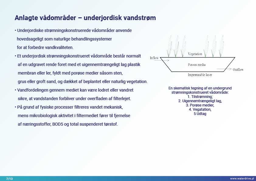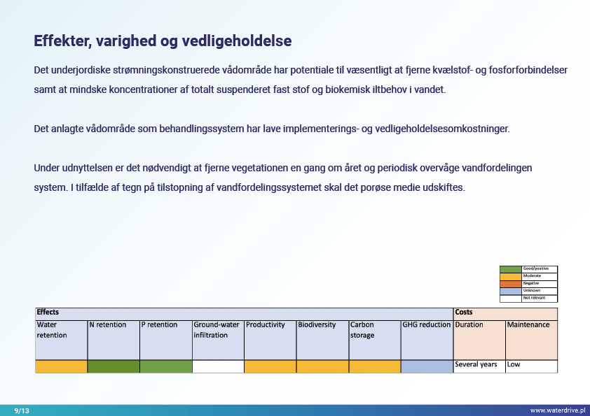 Også anlæggelse af kunstige vådområder, både med overflade- og underjordisk strømning, er en løsning med mange miljømæssige fordele. Først og fremmest har de evnen til at reducere forureningen, øge vandretentionen og skabe nye levesteder og dermed øge biodiversiteten.