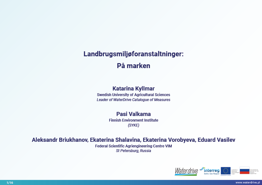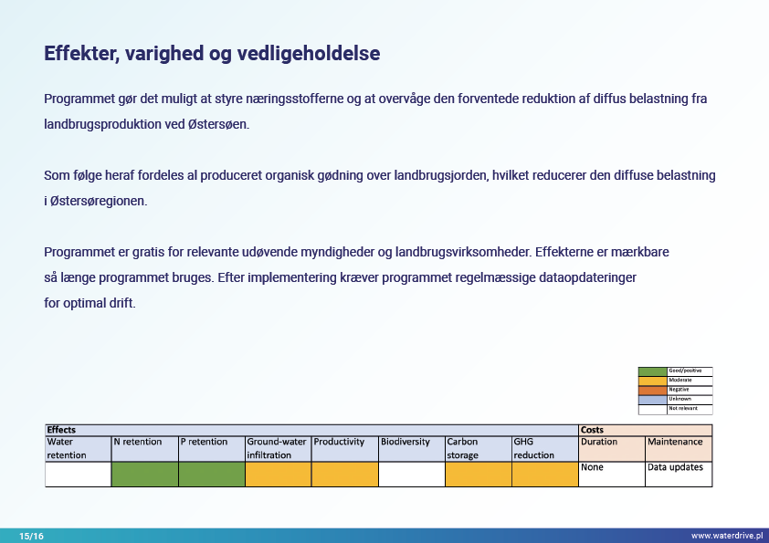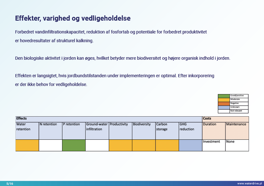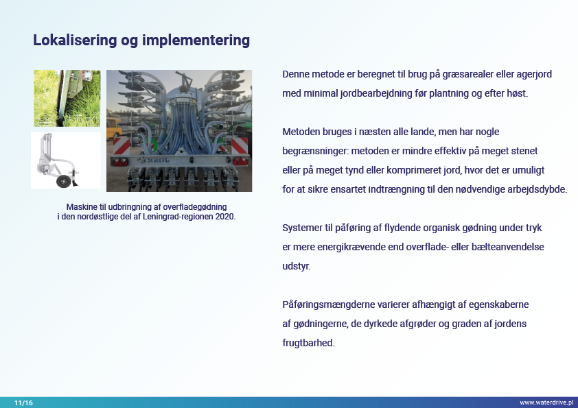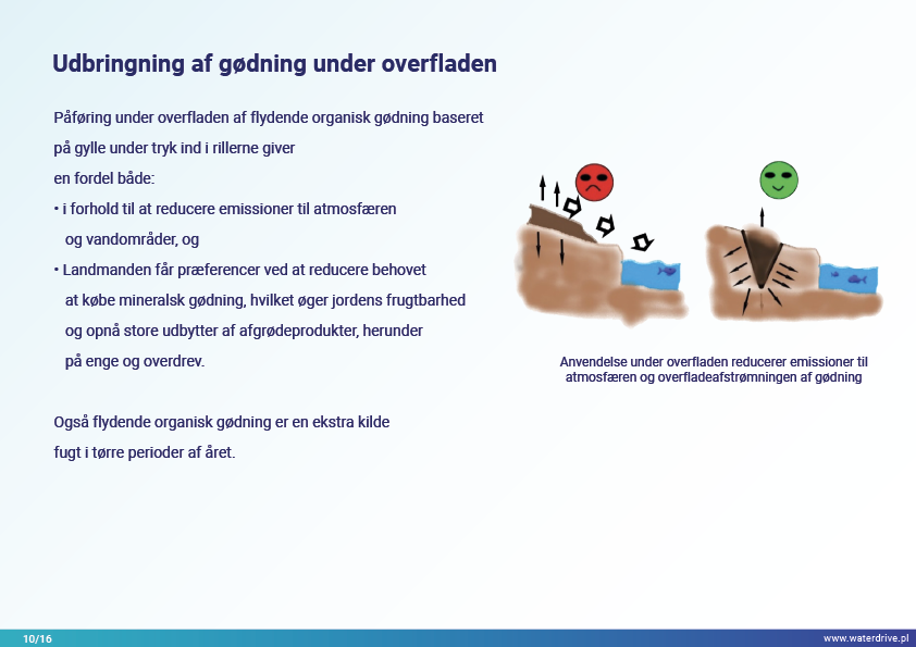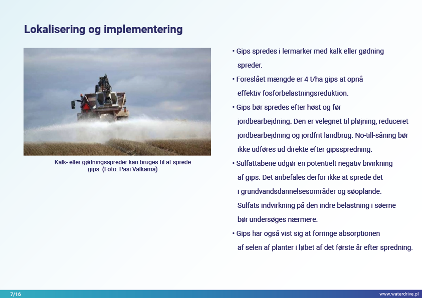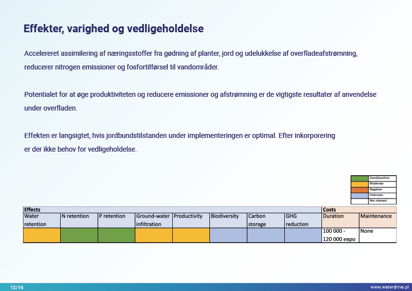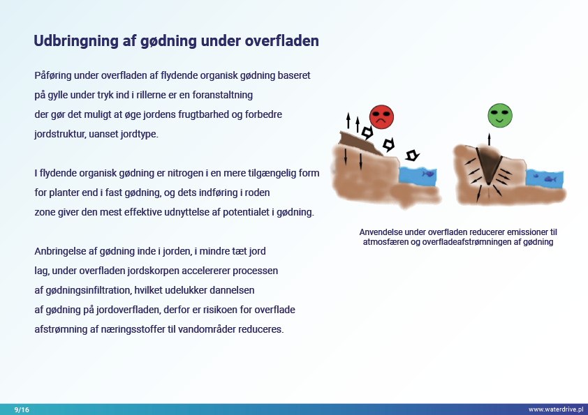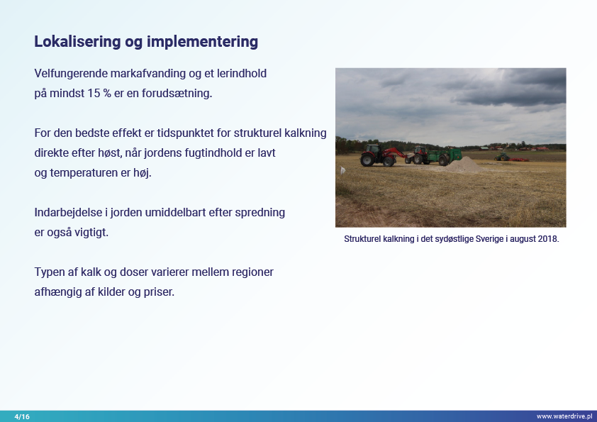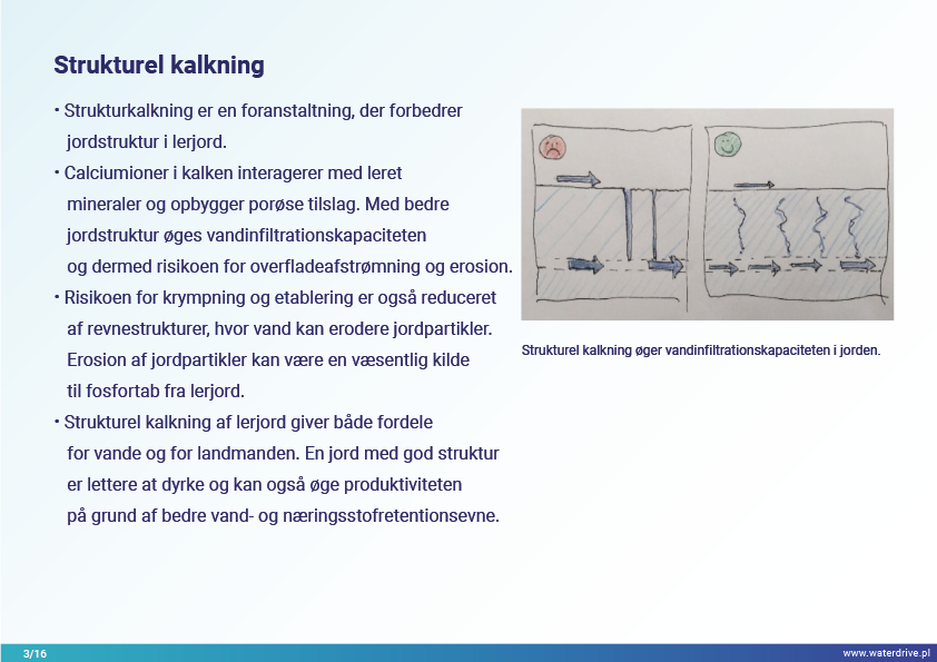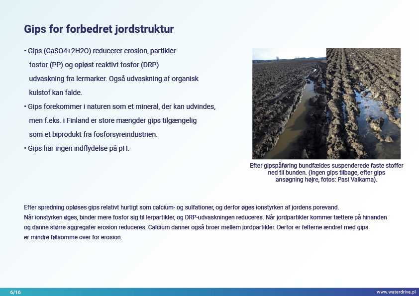 I Waterdrive Catalogue of Measures (https://www.slu.se/waterdrive) blev der udvalgt to tiltag til forbedring af jordstrukturen: strukturel kalkning og gipspåføring, som reducerer jorderosion. De næste to præsenterede tiltag, underjordisk udbringning af gødning og overvågning af gødningstilførsel i oplandsskalaen, indikerer potentialet for bæredygtig gødningsudbringning for at hjælpe med at reducere vandforurening.