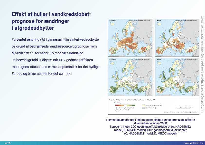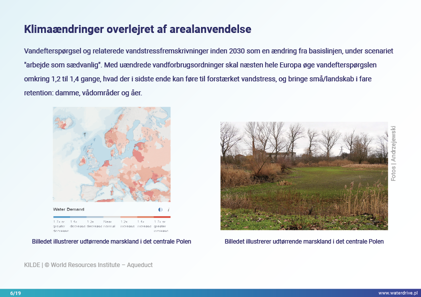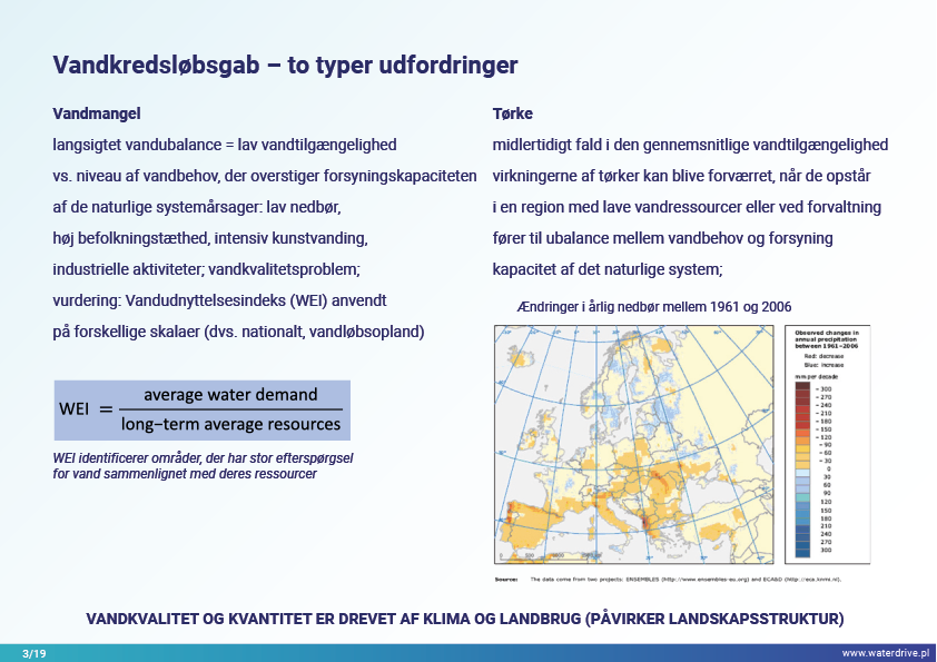 Inden for vandforvaltning beskæftiger vi os kun med tre, men snarere kritiske udfordringer – der er for lidt, for meget vand, eller det er forurenet. Disse problemer hænger normalt sammen, og løsningen af det ene kan i sidste ende uddybe det andet (såsom beskyttelse mod oversvømmelser i byer baseret på effektiv vandudstrømning, hvad der bidrager til UHI og grundvandsspejlsfald). Manglen eller overskud af vand opstår efterfølgende som følge af sæsonbestemte nedbørsvariationer, problemer med vandfordeling og brugsintensitet. Mangel på vand påvirker jordstrukturen, hvilket gør den mindre permeabel, udløser vinderosion, forringer økosystemer, der fungerer som vandlagre: floder, søer, damme, vådområder, skove og øger koncentrationen af forurening i vandområder. Vandoverløb forårsager vanderosion, udvaskning af forurening, hydraulisk påvirkning af floder. Med stigende klimavariation og mere intens vandforbrug i landbruget vil disse processer højst sandsynligt intensiveres i de næste årtier.