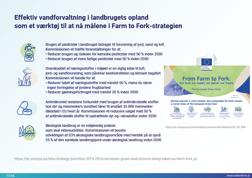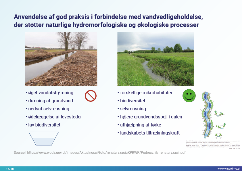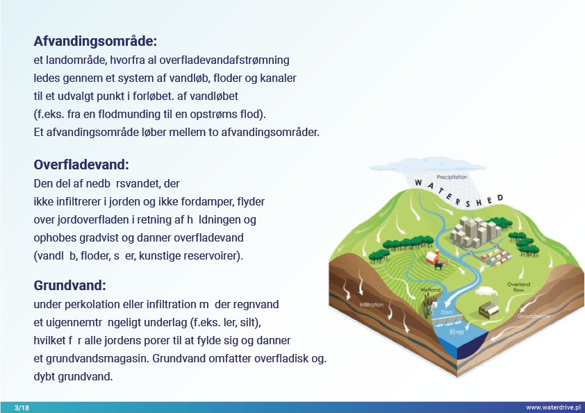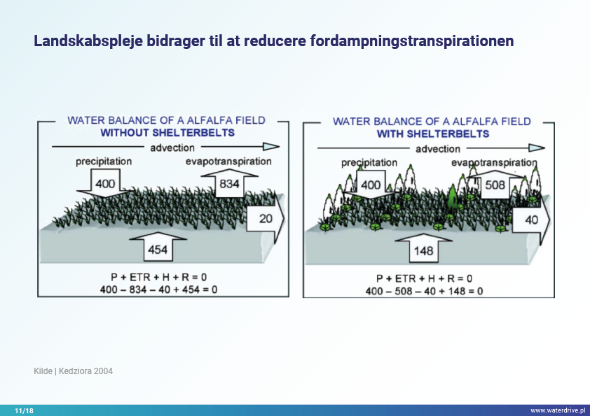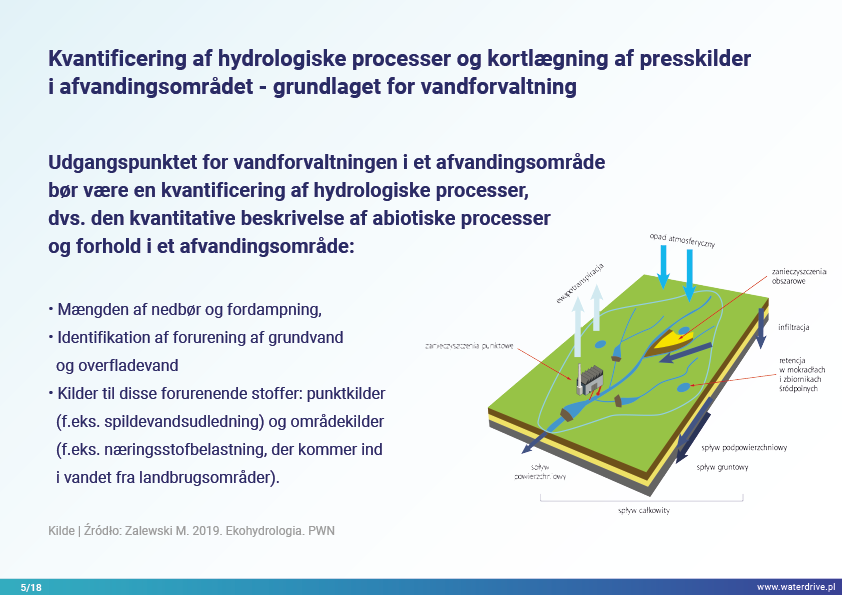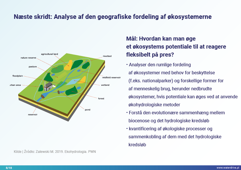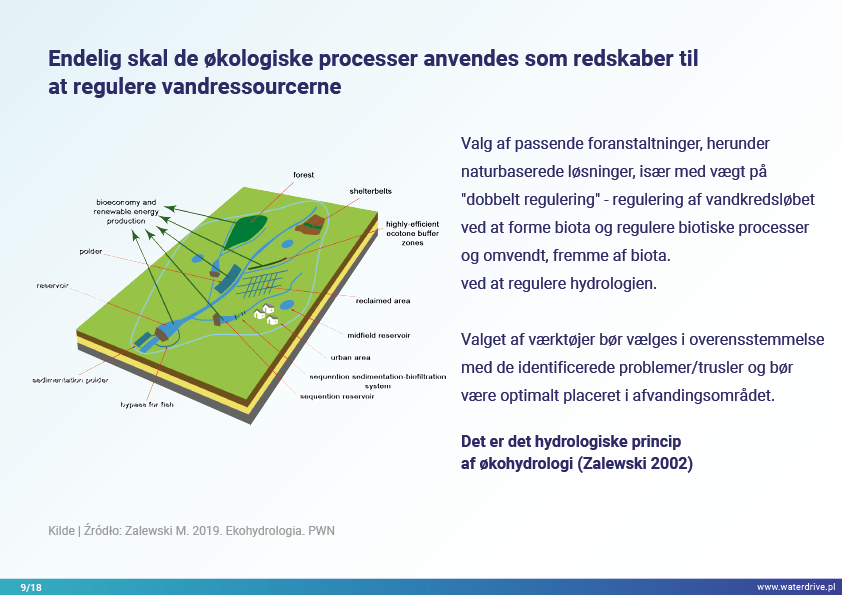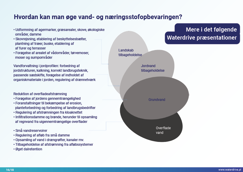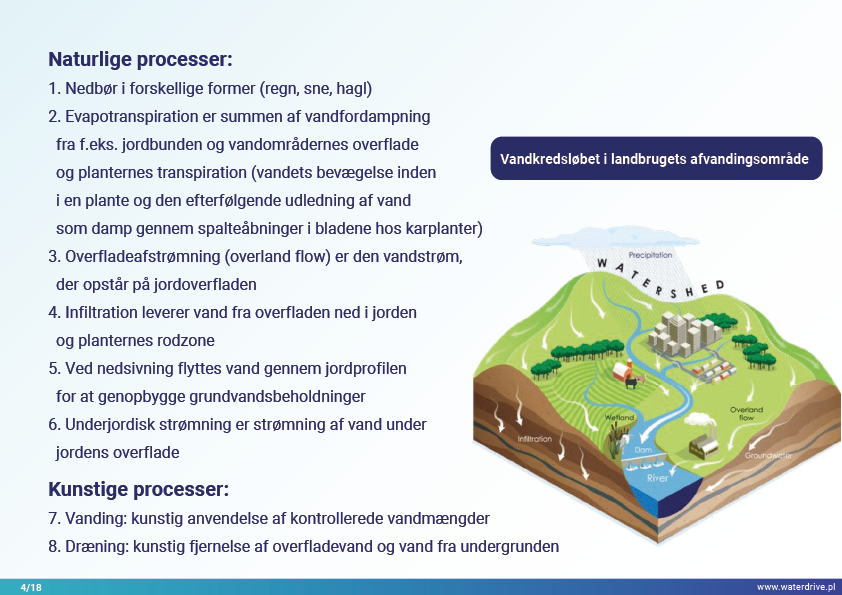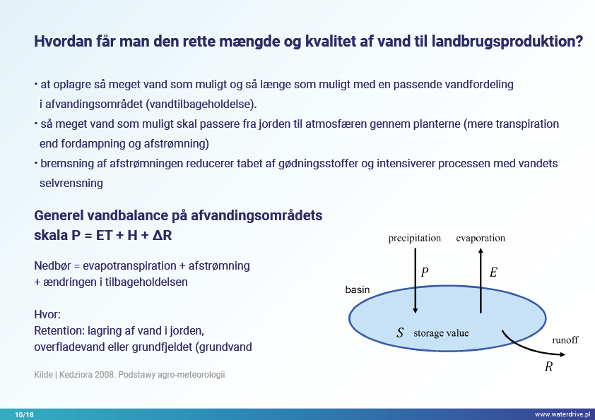 I denne præsentation forklarer vi begrebet et opland (flodbassin) samt de forskellige processer, der udgør vandets kredsløb. Vi præsenterer også tre trin i vandforvaltning baseret på principperne for økohydrologi (Zalewski 2002), som forudsætter "dual-regulering" - regulering af vandkredsløbet ved at forme biota og regulere biotiske processer og omvendt, forstærke biota ved at regulere hydrologi. De præsenterede gode praksisser viser, hvordan vi kan påvirke stigningen i vandretention og reduktion af næringsstofafstrømning på landskab, jord, drænsystem, overfladevand og lavt grundvandsniveau. Dette er en invitation til flere præsentationer!