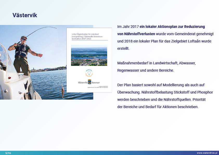 Die Gemeinde Västervik (Schweden) hat eine lange Küste und einen großen Schärengarten in der Ostsee. 2017 wurde der Lokale Aktionsplan zur Verringerung von Nährstoffverlusten zur Verringerung der Eutrophierung der Ostsee verabschiedet. Der Plan nennt eine Reihe von Minderungsmaßnahmen, die in landwirtschaftlichen Gebieten angewendet werden sollten (z. B. strukturelle Kalkung, Filtergräben, zweistufige Gräben, Phosphorteiche, Feuchtgebiete und kontrollierte Entwässerung). Die Maßnahmen wurden auf die identifizierte Problematik abgestimmt und der Standort im Einzugsgebiet optimal gewählt.