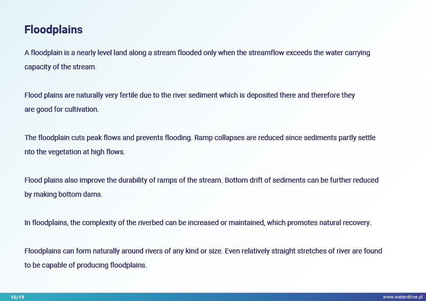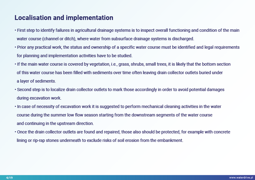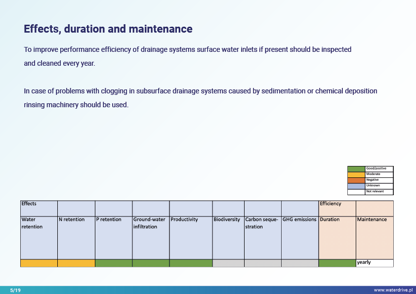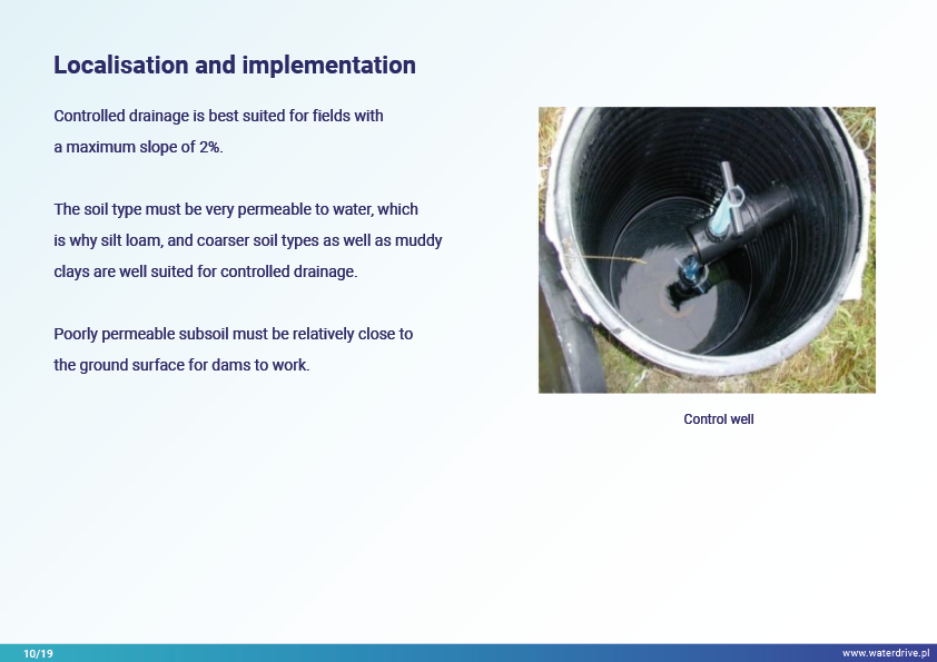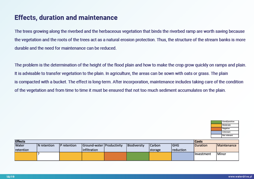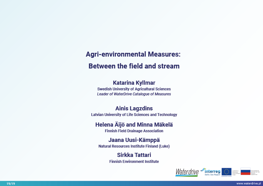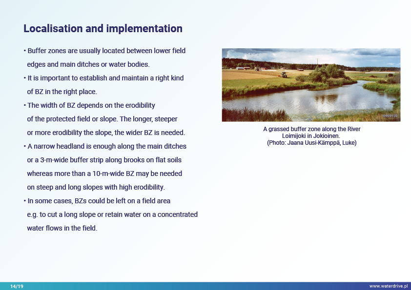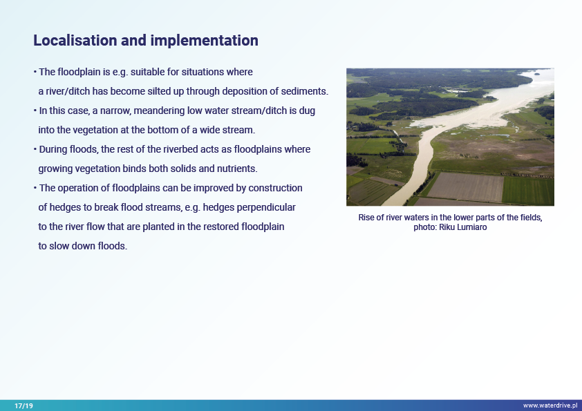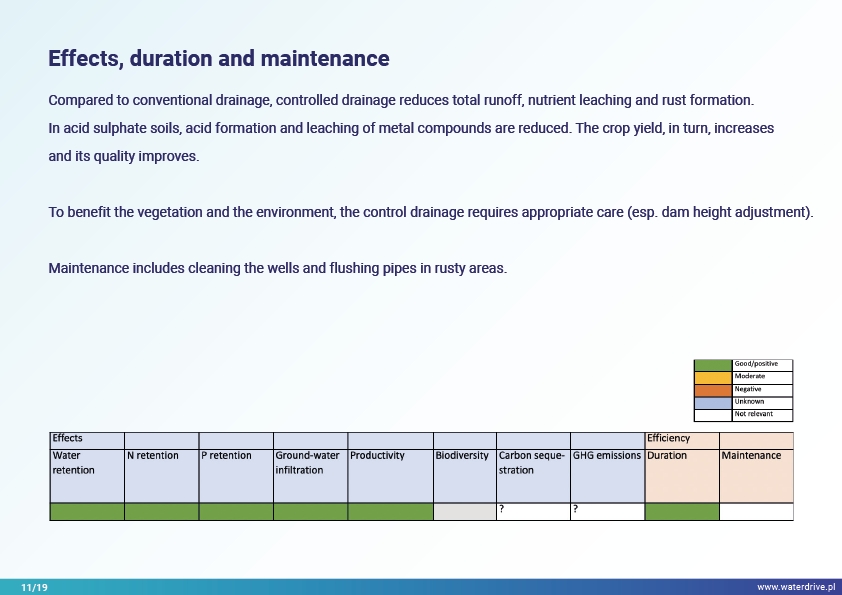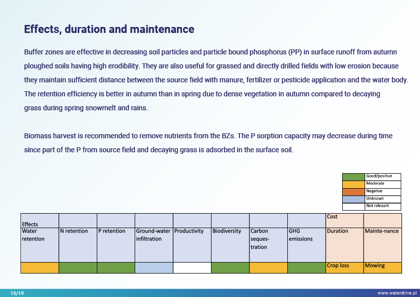Another group of agri-environmental measures presented in the Waterdrive Catalogue of Measures (https://www.slu.se/waterdrive) are measures at the interface between land and water. The first two relate to the functioning of the drainage system: the renovation of drainage systems and a controlled drainage system allowing the control of water flow and the reduction of nutrients leaching. The use of buffer zones and floodplains is a multi-benefit measure, e.g. retains sediment, nutrients and other pollutants, and enhances biodiversity.