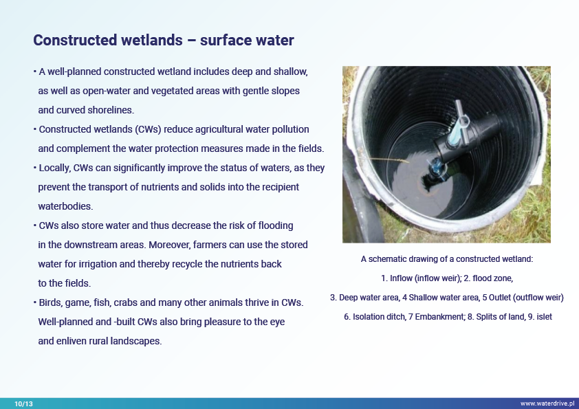 The last group of measures presented in the Waterdrive Catalogue of Measures (https://www.slu.se/waterdrive) are agri-environmental measures directly related to aquatic ecosystems: two-stage ditches and constructed wetlands. Reconstruction of channels or regulated watercourses consisting in delineation of the main channel and floodplain terraces serves the protection against flooding and drought, self-purification of rivers and increase of biodiversity.