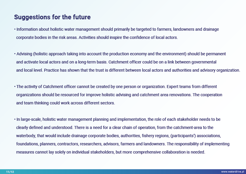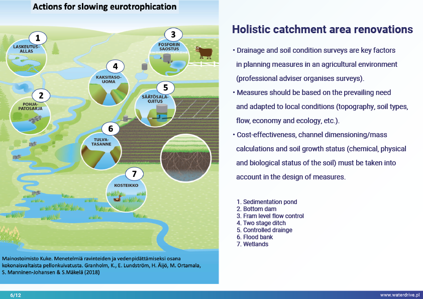Catchment-scale implementation of holistic water management probably guarantees the best possible result for both drainage and soil structure improvement and minimization of nutrient losses to waterbodies taking into consideration biodiversity, water quality and fishery.