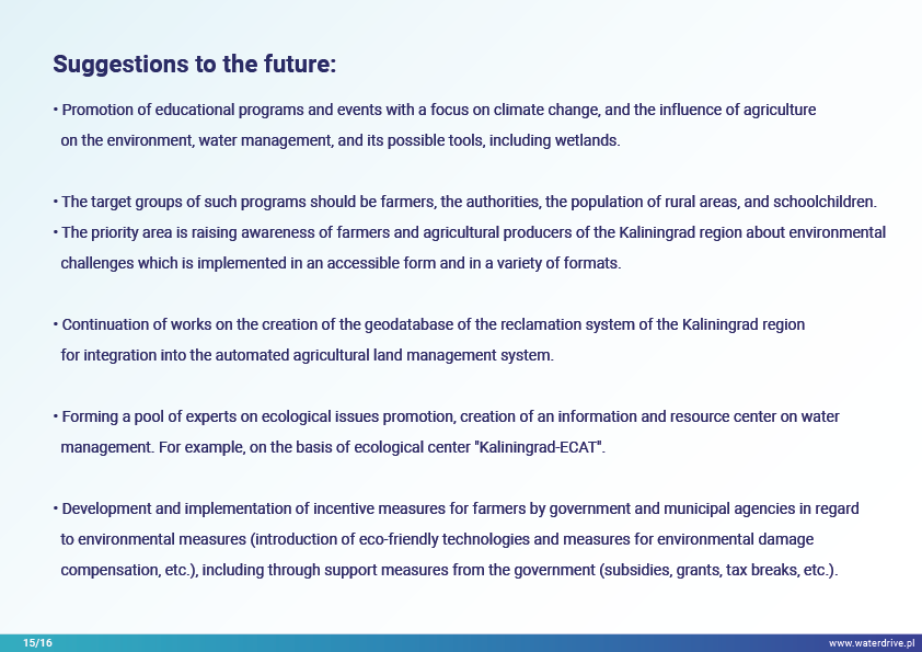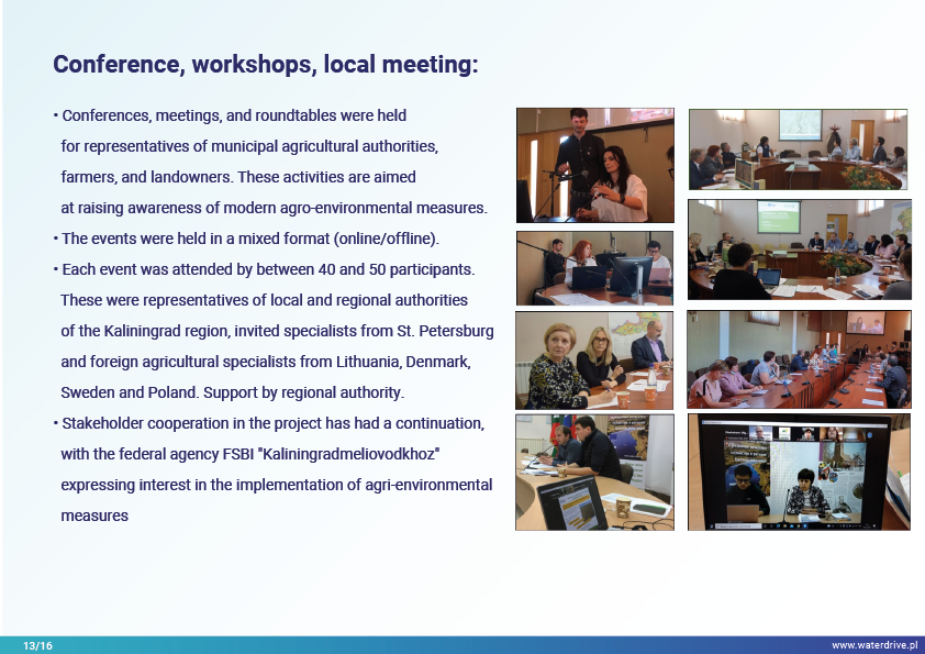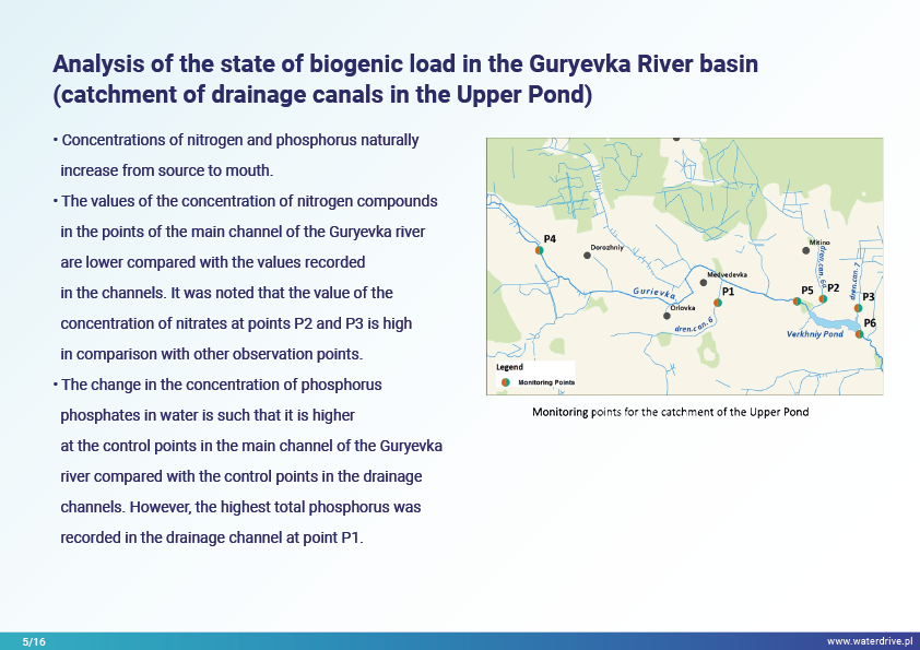 The Guryevka River (Mühlen Fluss) is a small river in the Kaliningrad region whose main sources of pollution are human settlements, industrial plants and agriculture. During the Waterdrive project, water quality monitoring was performed and showed that nitrogen and phosphorus concentrations increase with the river flow from source to mouth. The results of the feasibility study on the construction of artificial wetlands were presented, as well as the ongoing activities related to the restoration of land melioration system. Numerous conferences, meetings and "round tables" were held to raise awareness of modern agri-environmental measures.