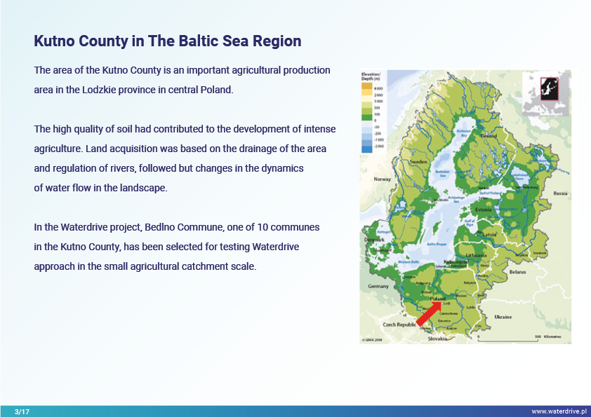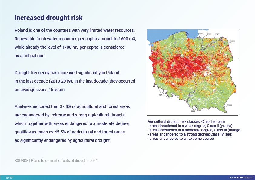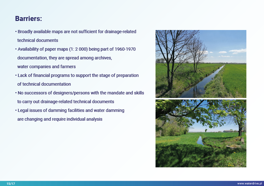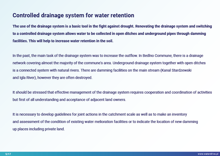The area of Kutno County is an important agricultural production area in Lodz Province (Poland), which was severely affected by drought in 2018 and 2019. Renovation of the drainage system and transition to a controlled/dual-function drainage system is an essential measure in the fight against drought.