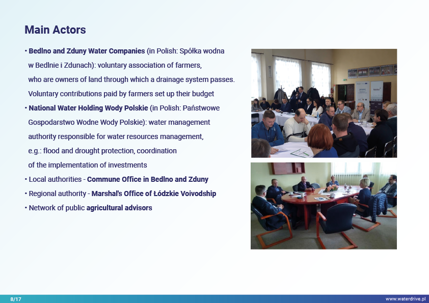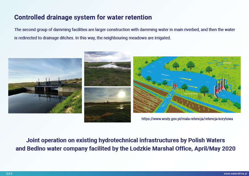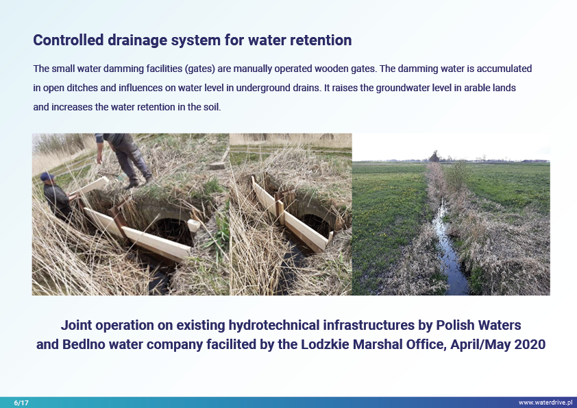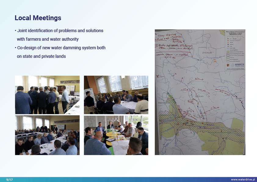 We present the progress of local multi-stakeholder cooperation to increase water retention, in which the main actors are the water companies (voluntary association of farmers) and the National Water Holding Wody Polskie. Regional and national initiatives have strongly stimulated local actions.