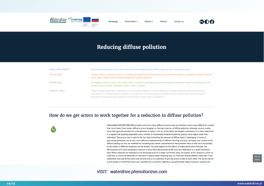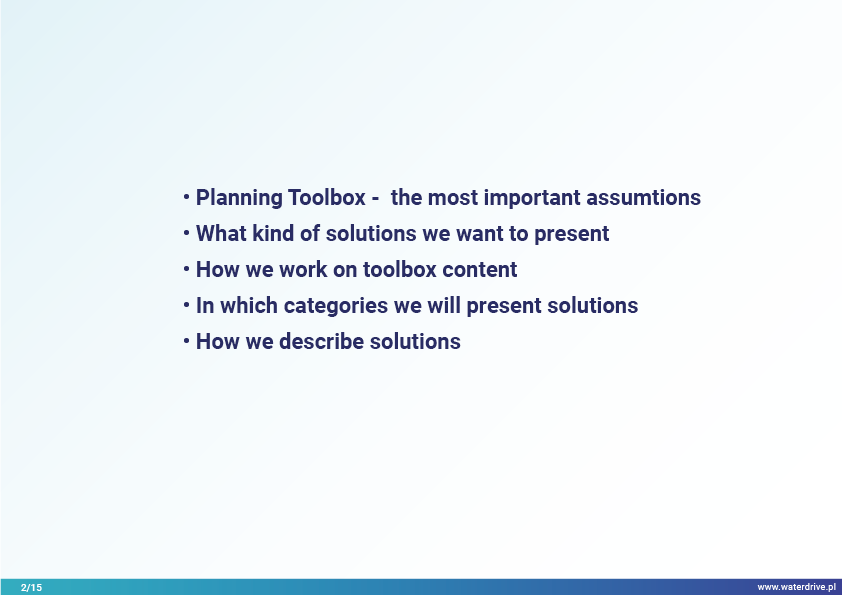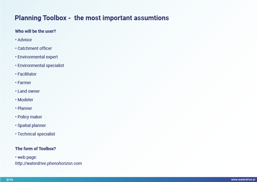 The Planning Toolbox (https://waterdrive.cdr.gov.pl) is a freely available website to learn about good land use planning practices, what tools to use, how to go deeper, and who to involve in the process to achieve desired environmental outcomes while meeting social needs.