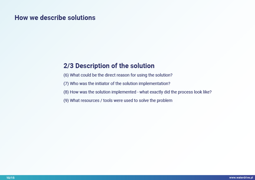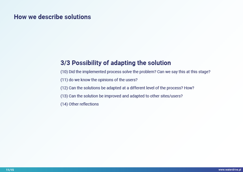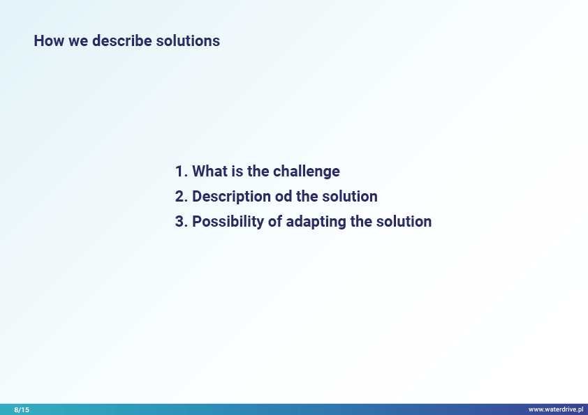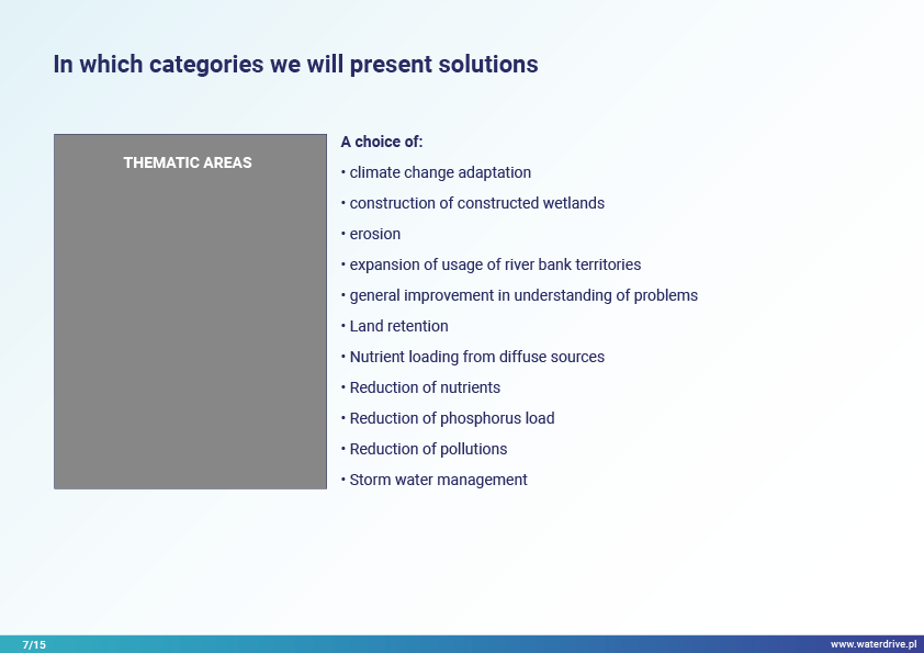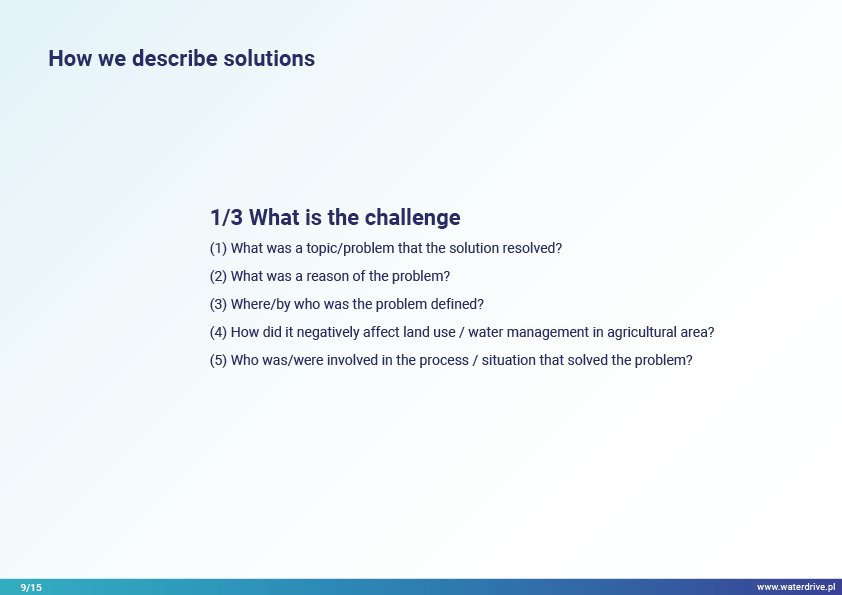 The solutions are based on examples and cover different thematic areas in the process of spatial planning on agricultural land in the context of achieving the expected environmental indicators related to water management