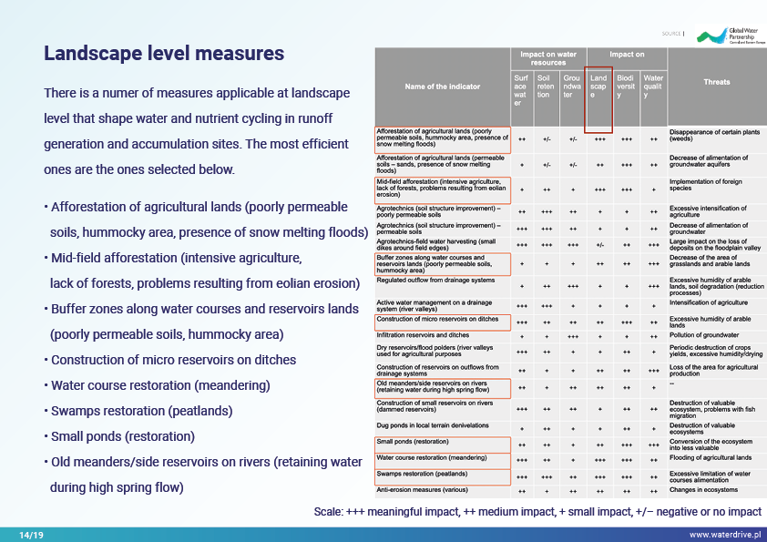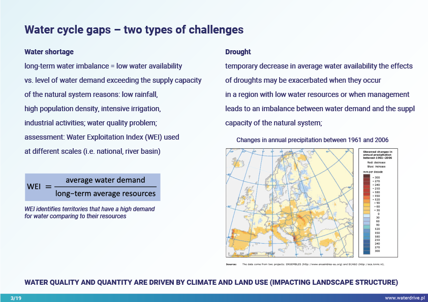 In the area of water management we deal with only three, but rather critical challenges – there is too little, or too much water or it is polluted. Those issues are usually interconnected, thus solving one may eventually deepen the other (like flood protection in cities based on efficient water outflow, what contributes to UHI and groundwater table drop). The shortage or surplus of water happen subsequently as a result of seasonal rainfall variation, problems with water distribution and use intensity. Shortage of water impacts soil structure making it less permeable, triggers wind erosion, deteriorates ecosystems acting as water storages: rivers, lakes, ponds, wetlands, forests and increases concentration of pollution in water bodies. Water overflow causes water erosion, washing out pollution, hydraulic impact on rivers. With increasing climate variation and more intense water use in agriculture, those processes will most probably intensify in next decades.