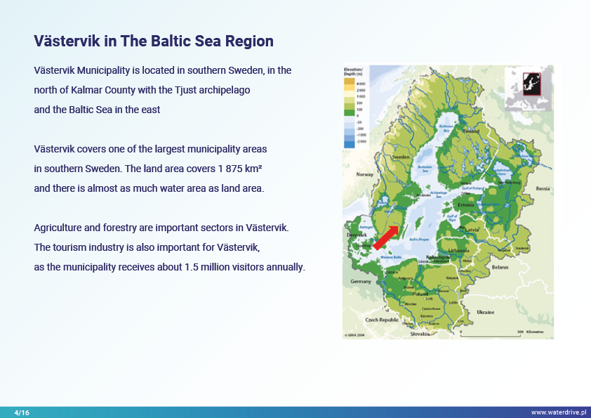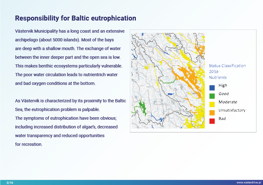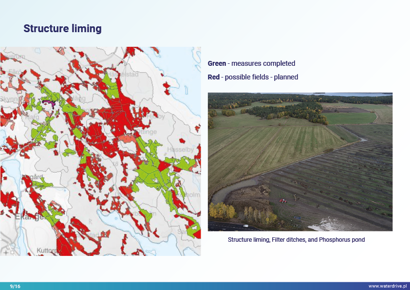 The municipality of Västervik (Sweden) has a long coast and a large archipelago in the Baltic Sea. In 2017, the Local Action Plan to Reduce Nutrient Losses in order to reduce the eutrophication of the Baltic Sea was approved. The Plan identifies a number of mitigation measures that should be applied in agricultural areas (e.g. structural liming, filtr ditches, two step ditches, phosphorus ponds, wetlands and controlled drainage). The measures were matched to the identified problem, and their location was selected as optimal in the catchment area.