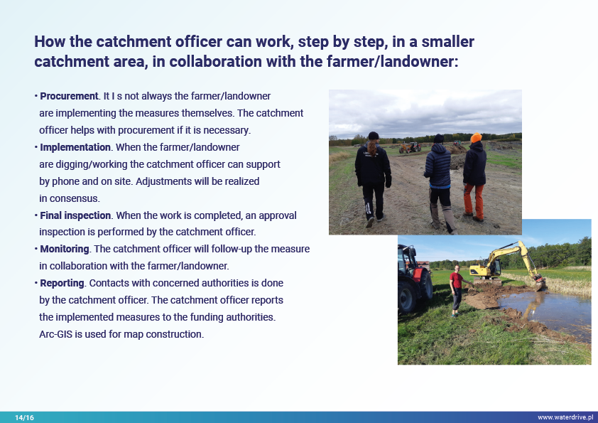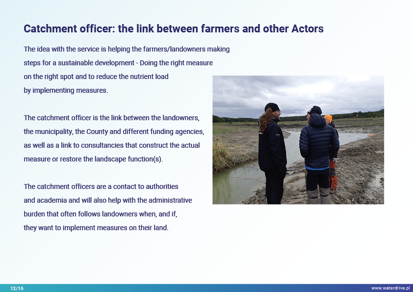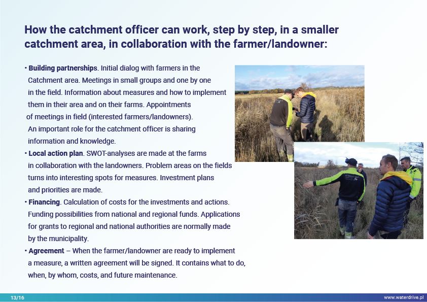 The idea of "Doing the right things in the right place" inspires all partners in the Waterdrive project. Experiences from the work of a catchment officer in cooperation with farmers and landowners in implementing the action plan are presented.