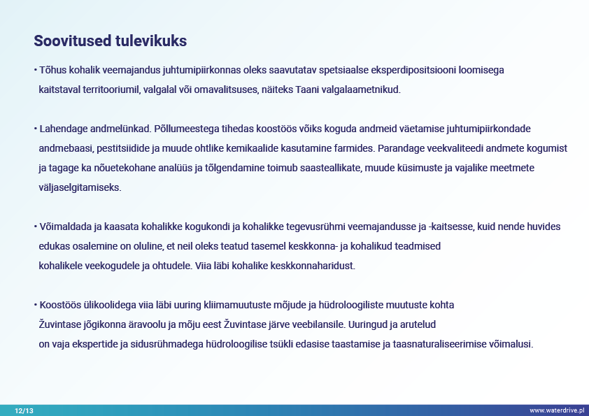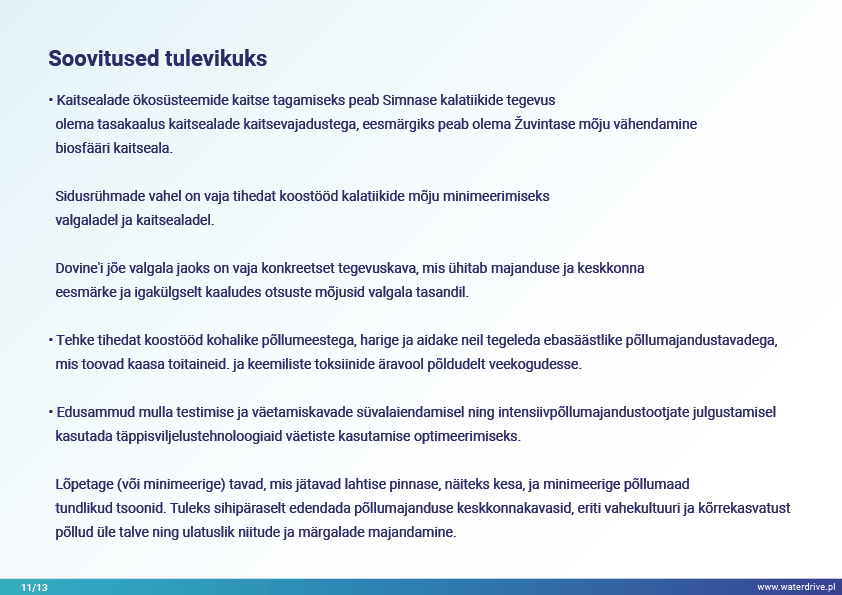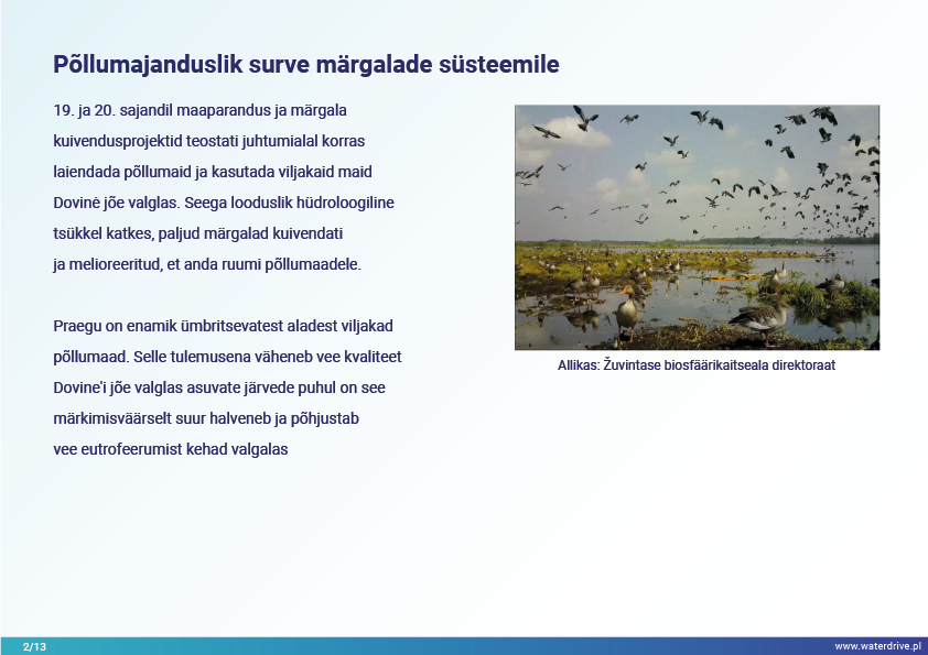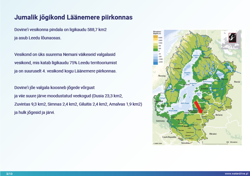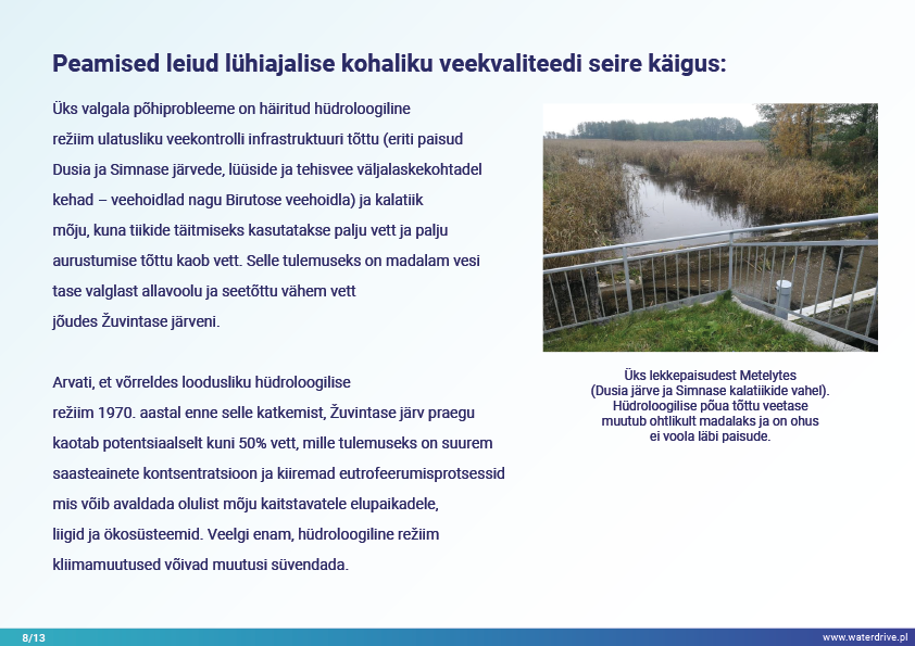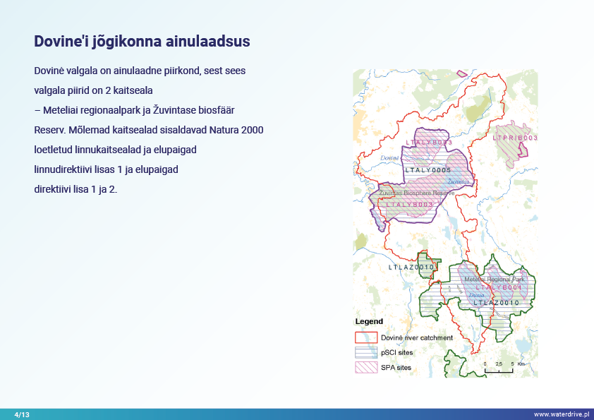 Dovinė valgala (Leedu) on ainulaadne piirkond, kuna valgala piires asub 2 kaitseala – Meteliai regionaalpark ja Žuvintase biosfäärikaitseala. 19. ja 20. sajandil viidi juhtumialal läbi maaparandus- ja märgalade kuivendusprojekte, et laiendada põllumaad. Lühiajalise lokaalse veekvaliteedi seire analüüs näitab muuhulgas kalatiikide mõju vee kvaliteedile. Samuti tutvustame kohaliku koostöö algatamise etapist saadud õppetunde.
