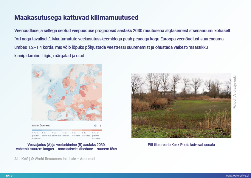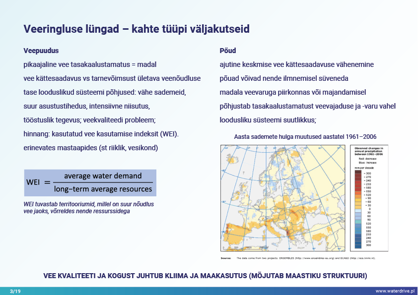 Veemajanduse valdkonnas tegeleme vaid kolme, kuid pigem kriitilise väljakutsega – vett on liiga vähe, liiga palju või see on reostunud. Need probleemid on tavaliselt omavahel seotud, nii et ühe lahendamine võib lõpuks teist süvendada (näiteks tõhusal vee väljavoolul põhinev üleujutuskaitse linnades, mis aitab kaasa UHI-le ja põhjaveetaseme langusele). Veepuudus või ülejääk tekib hiljem sademete hooajalise kõikumise, vee jaotusprobleemide ja kasutamise intensiivsuse tõttu. Veepuudus mõjutab mulla struktuuri, muutes selle vähem läbilaskvaks, vallandab tuuleerosiooni, halvendab veehoidlatena toimivaid ökosüsteeme: jõgesid, järvi, tiike, märgalasid, metsi ja suurendab reostuse kontsentratsiooni veekogudes. Vee ülevool põhjustab vee erosiooni, väljauhtumist, reostust, hüdraulilist mõju jõgedele. Kliimamuutuste suurenemise ja vee intensiivsema kasutamisega põllumajanduses need protsessid tõenäoliselt järgmistel aastakümnetel intensiivistuvad.