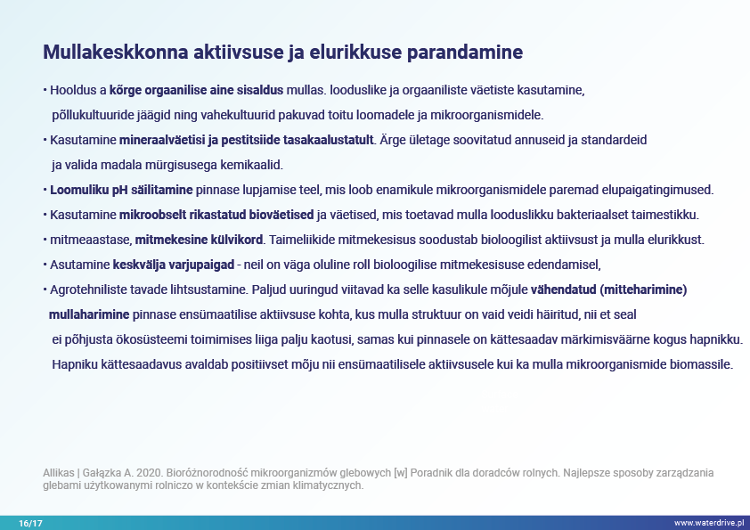 Käesolevas ettekandes keskendume mulla rollile veepidavuses ja seeläbi toitainete kadude ärahoidmisel. Näitame, millised head põllumajandustavad aitavad kaasa mulla struktuuri eest hoolitsemisele, mulla orgaanilise aine sisalduse suurendamisele ja mulla erosiooni piiramisele