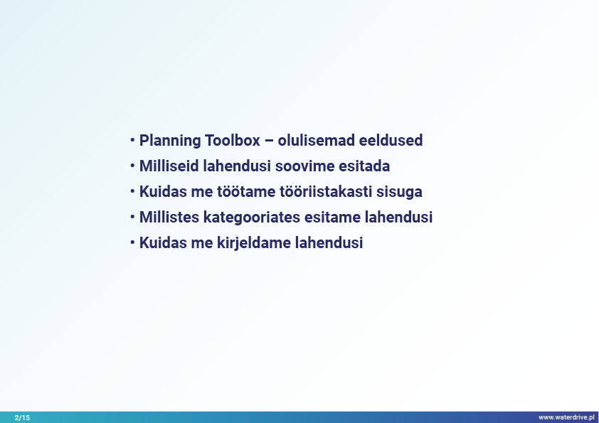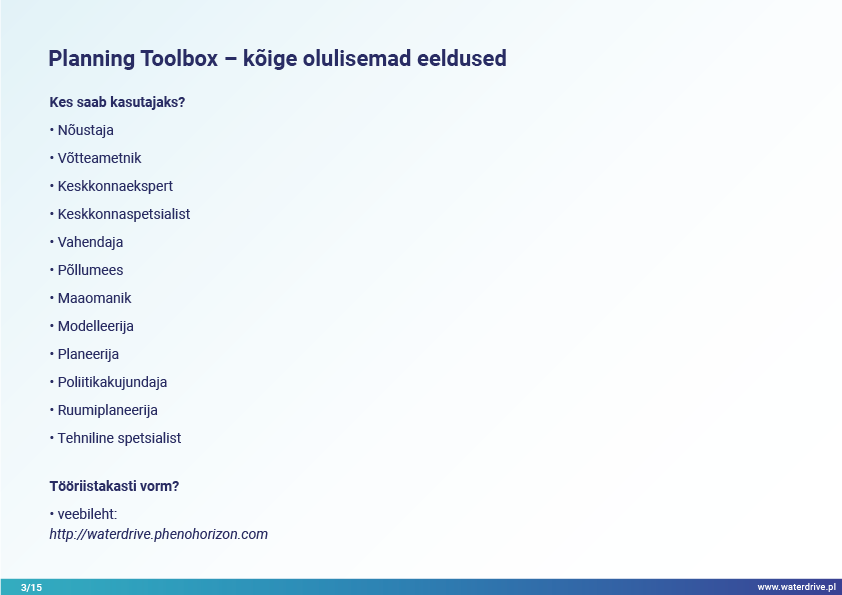 Planning Toolbox (https://waterdrive.cdr.gov.pl) on tasuta veebisait, mis annab teavet heade maakasutuse planeerimise tavade kohta, milliseid tööriistu kasutada, kuidas süveneda ja keda kaasata protsessi, et saavutada soovitud keskkonnaalased tulemused. sotsiaalseid vajadusi rahuldades.
