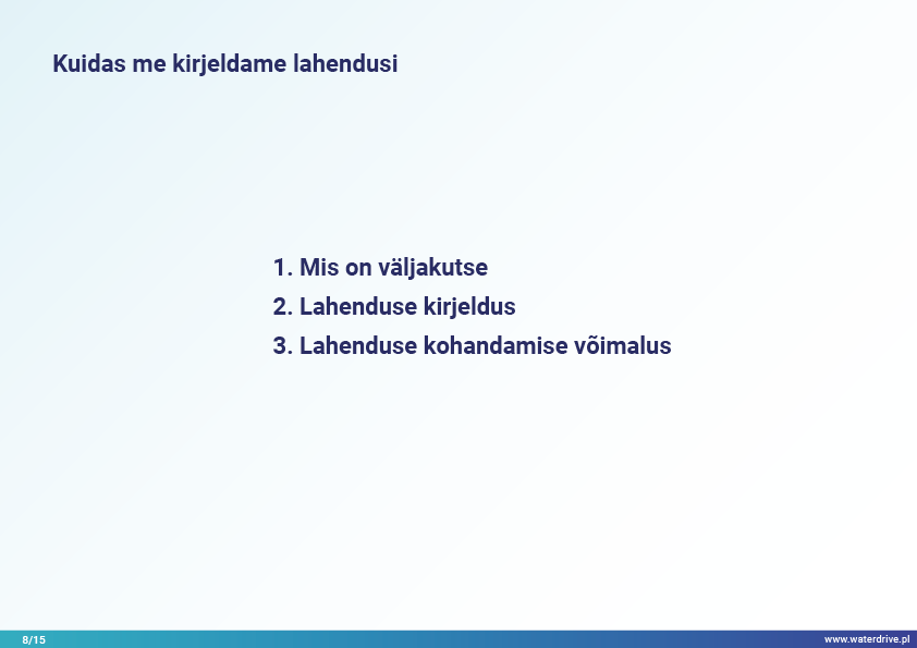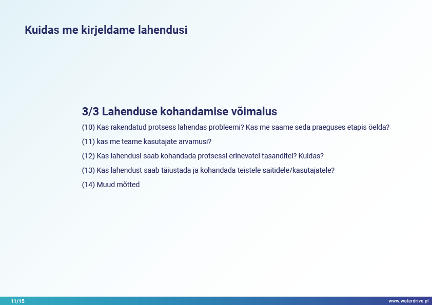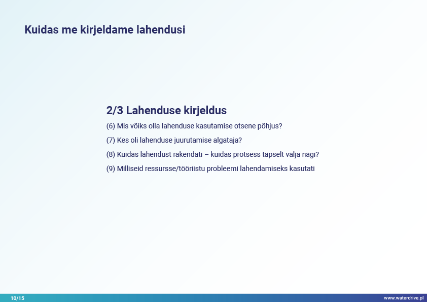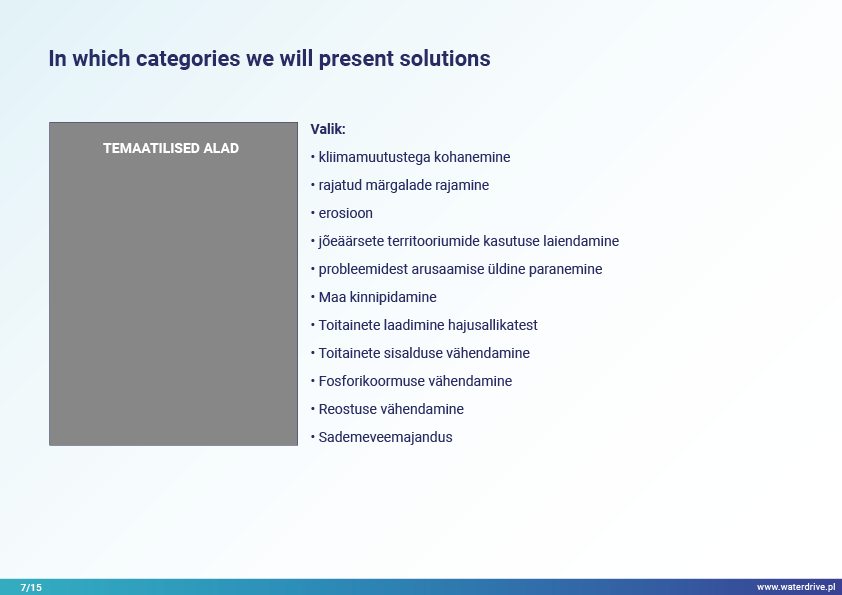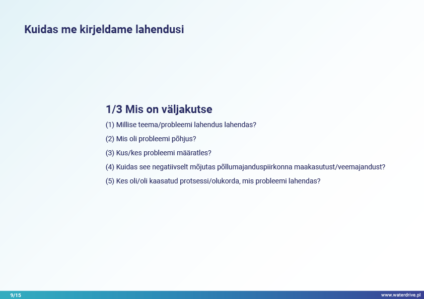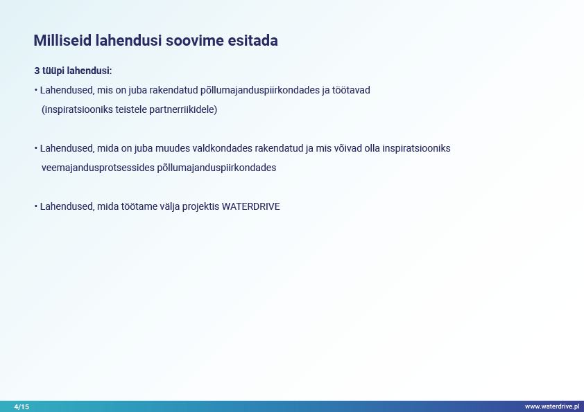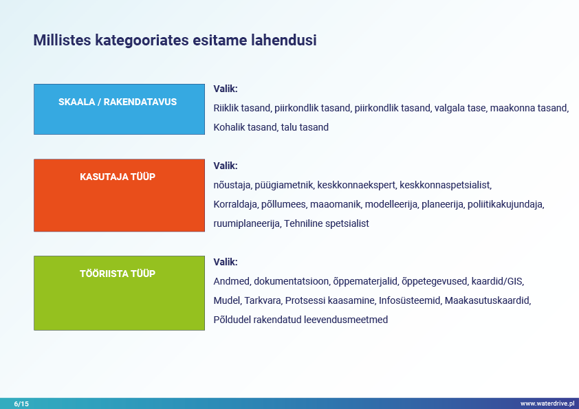 Lahendused põhinevad näidetel ja hõlmavad erinevaid teemavaldkondi põllumajandusmaa ruumilise planeerimise protsessis veemajandusega seotud eeldatavate keskkonnanäitajate saavutamise kontekstis.