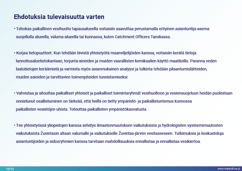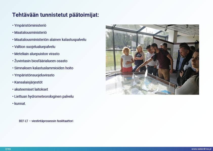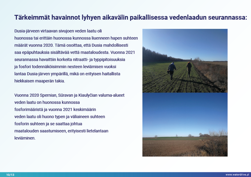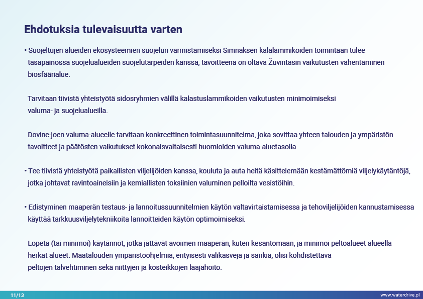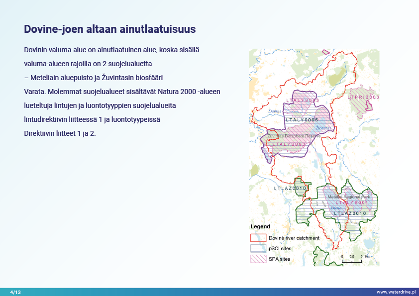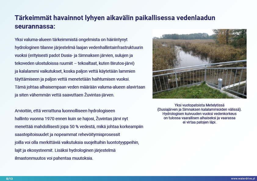 Dovinin valuma-alue (Liettua) on ainutlaatuinen alue, koska valuma-alueen rajojen sisällä sijaitsee 2 suojelualuetta – Meteliain aluepuisto ja Žuvintasin biosfäärialue. 1800- ja 1900-luvulla tapausalueella tehtiin maanparannus- ja kosteikkojen ojitushankkeita maatalousmaiden laajentamiseksi. Lyhyen aikavälin paikallisen vedenlaadun seurannan analyysi osoittaa mm. kalalammikoiden vaikutuksen veden laatuun. Esittelemme myös paikallisen yhteistyön aloitusvaiheesta opittuja kokemuksia.