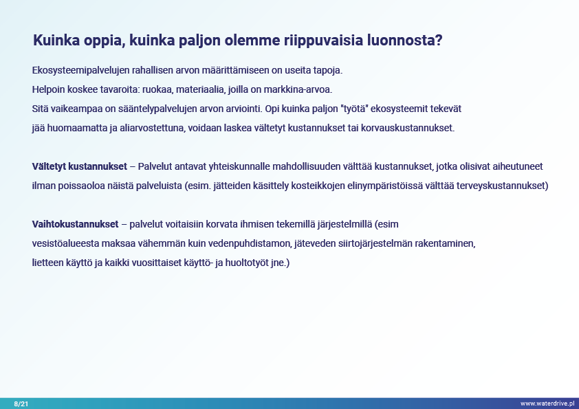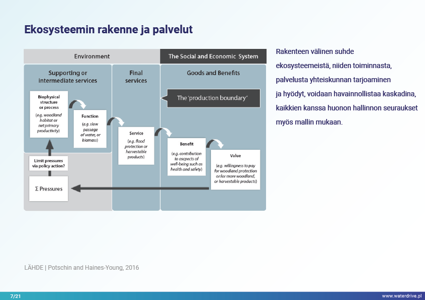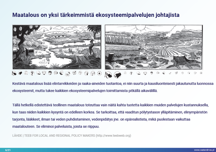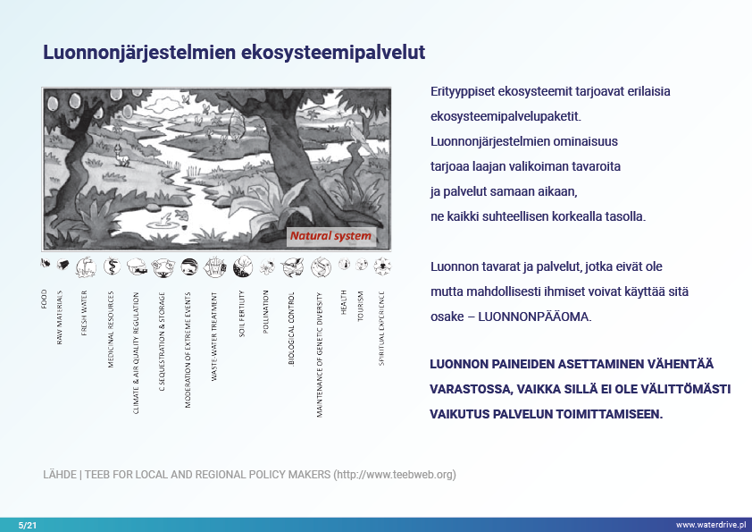 Selviytymisemme perustuu kykyyn ennallistaa ja suojella ekosysteemejä siinä mittakaavassa, joka varmistaa alhaisemman, mutta vakaan ja pitkän aikavälin tavaroiden ja palvelujen tuotannon luonnosta. Tämä edellyttää ekosysteemipalvelujen kartoittamista ja arviointia sekä politiikan ja hallinnon hotspottien määrittelyä.