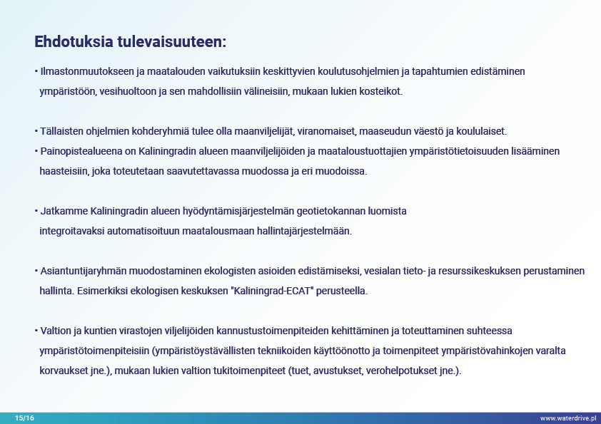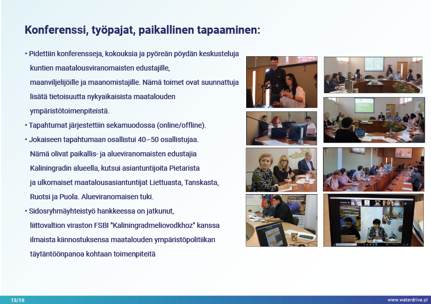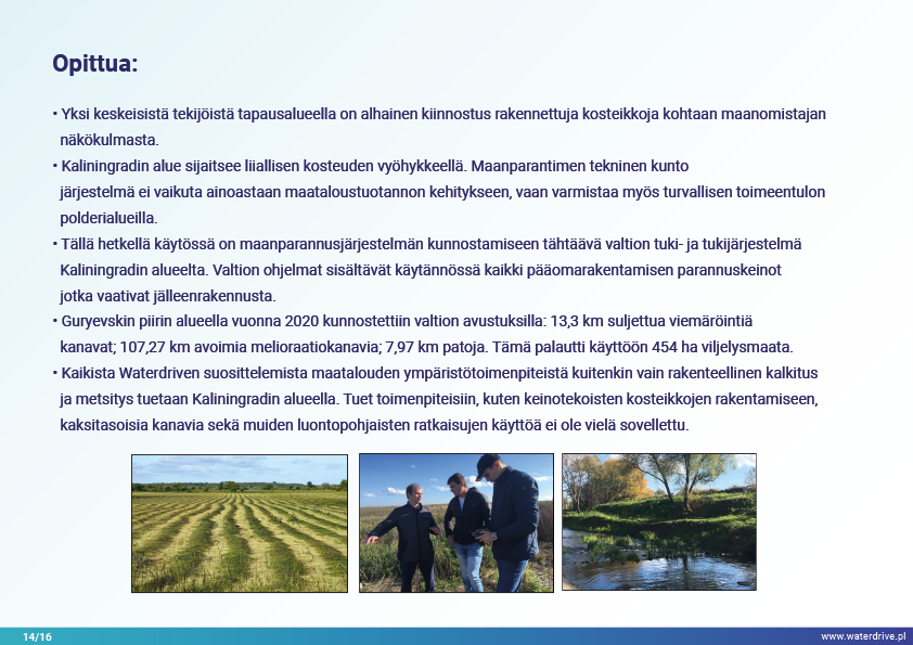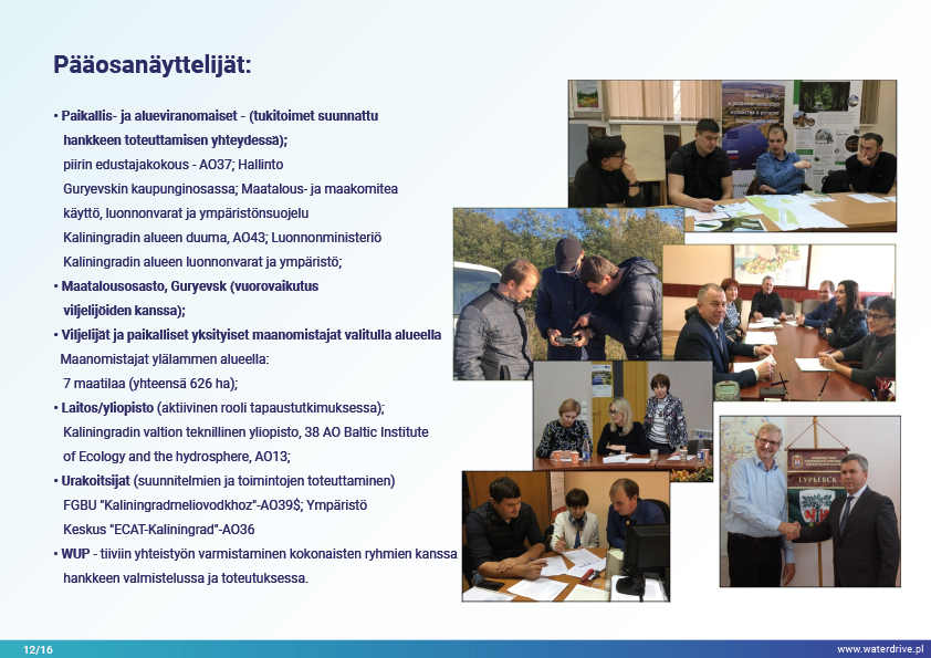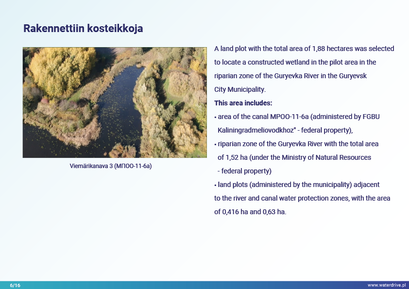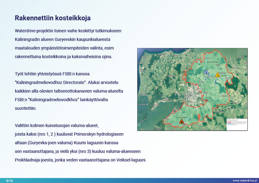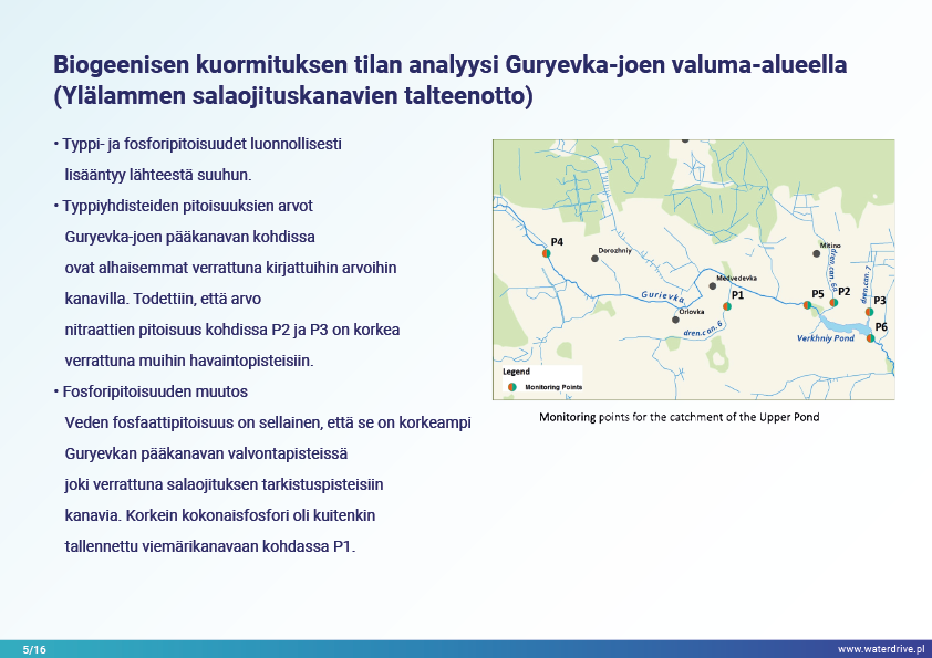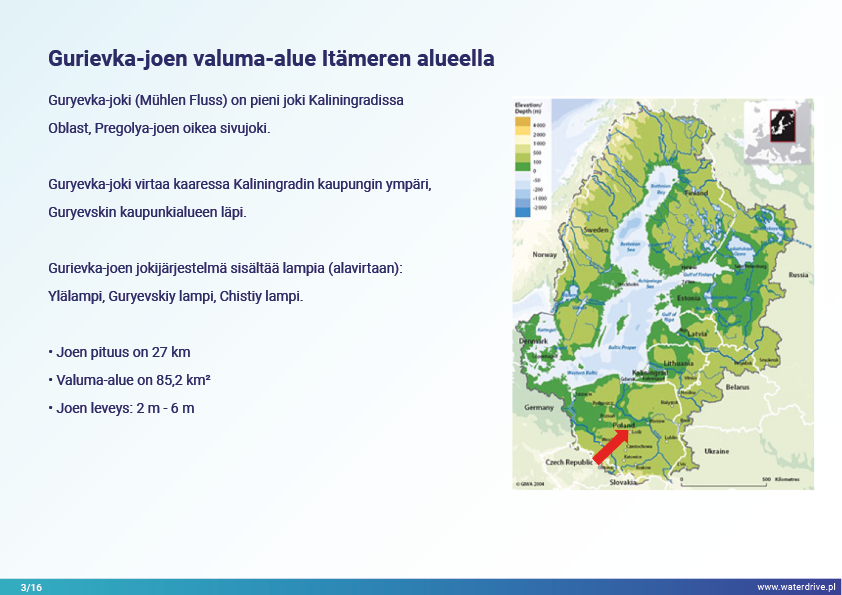 Guryevka-joki (Mühlen Fluss) on pieni joki Kaliningradin alueella, jonka pääasialliset saastelähteet ovat asutukset, teollisuuslaitokset ja maatalous. Waterdrive-projektin aikana suoritettiin vedenlaadun seurantaa, joka osoitti, että typpi- ja fosforipitoisuudet kasvavat joen virtauksen myötä lähteestä suulle. Esittelyssä esiteltiin tekokosteikkojen rakentamisen toteutettavuustutkimuksen tulokset sekä meneillään olevat meliorointijärjestelmän ennallistamiseen liittyvät toimet. Lukuisia konferensseja, kokouksia ja "pyöreän pöydän keskusteluja" pidettiin tietoisuuden lisäämiseksi nykyaikaisista maatalouden ympäristötoimenpiteistä.