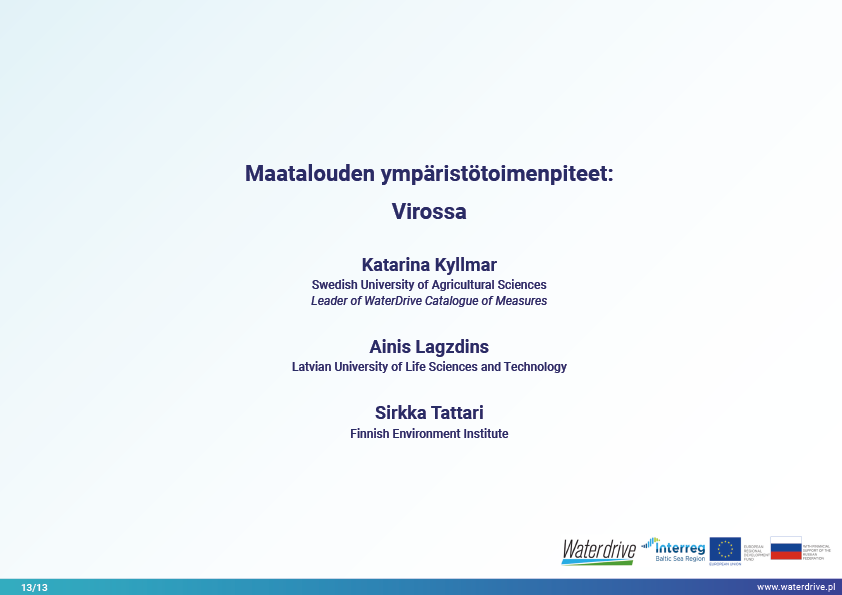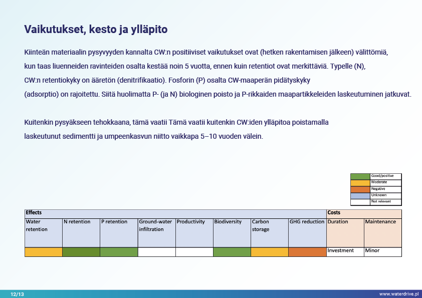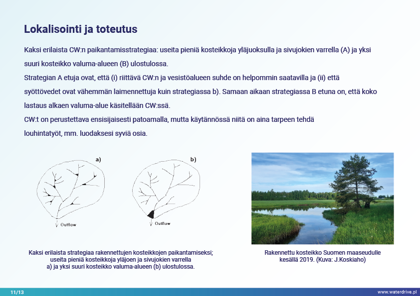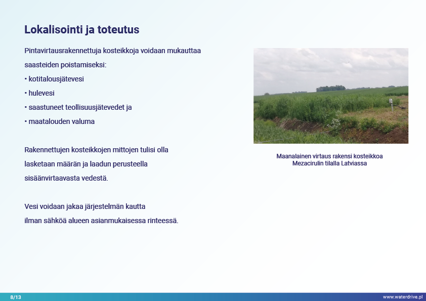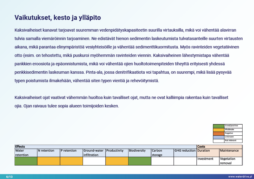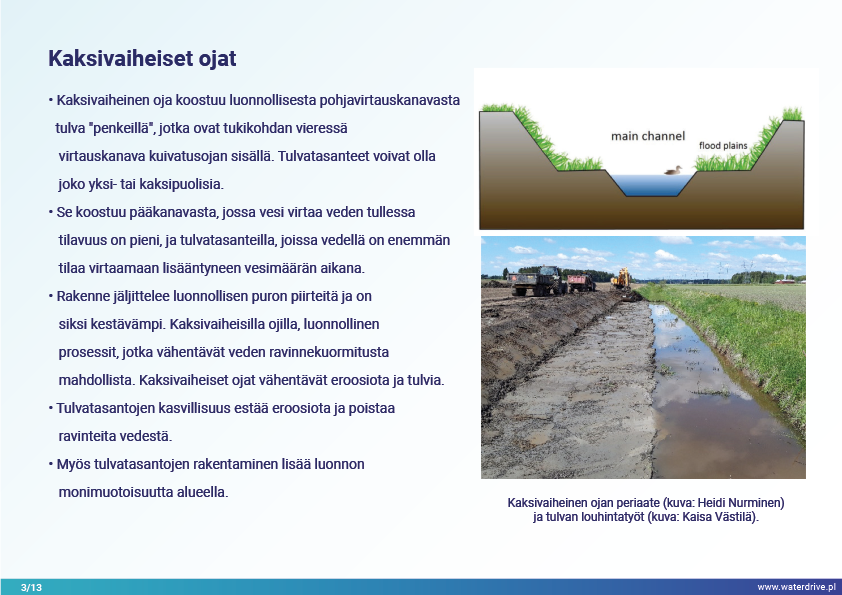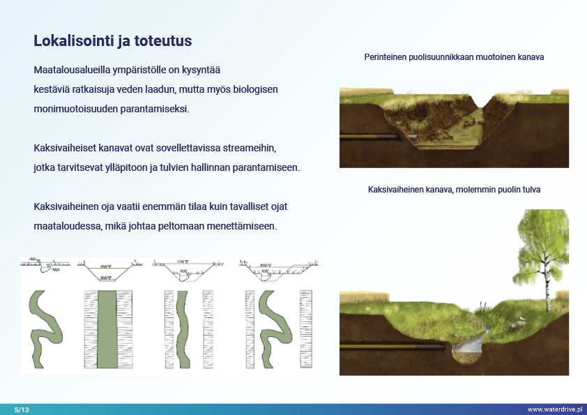 Viimeinen Waterdriven toimenpideluettelossa (https://www.slu.se/waterdrive) esitetty toimenpideryhmä on suoraan vesiekosysteemeihin liittyvät maatalouden ympäristötoimenpiteet: kaksivaiheiset ojat ja rakennetut kosteikot. Kanavien tai säänneltyjen vesistöjen jälleenrakentaminen pääväylän ja tulvaterassien rajaamisesta palvelee suojaa tulvilta ja kuivilta, jokien itsepuhdistumista ja luonnon monimuotoisuuden lisäämistä.