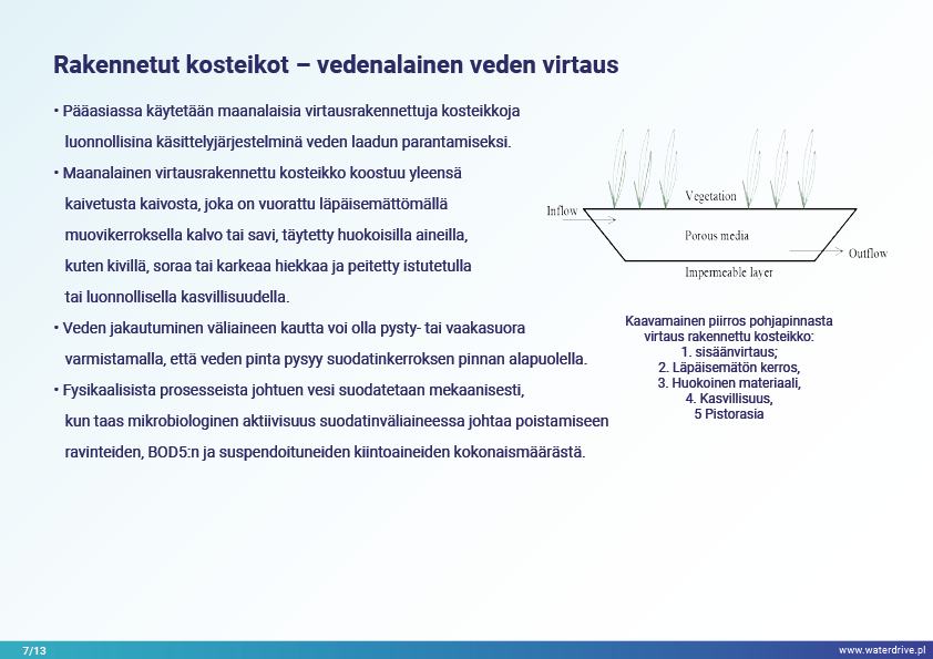 Myös keinotekoisten kosteikkojen rakentaminen, sekä pinta- että maanalainen virtaus, on ratkaisu, jolla on monia ympäristöhyötyjä. Ensinnäkin niillä on kyky vähentää saastumista, lisätä vedenpidätyskykyä ja luoda uusia elinympäristöjä, mikä lisää biologista monimuotoisuutta.