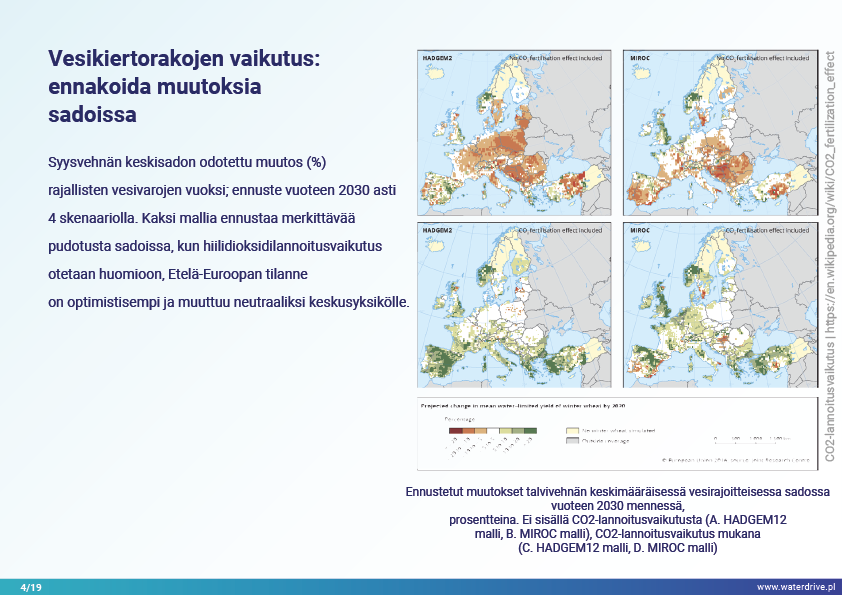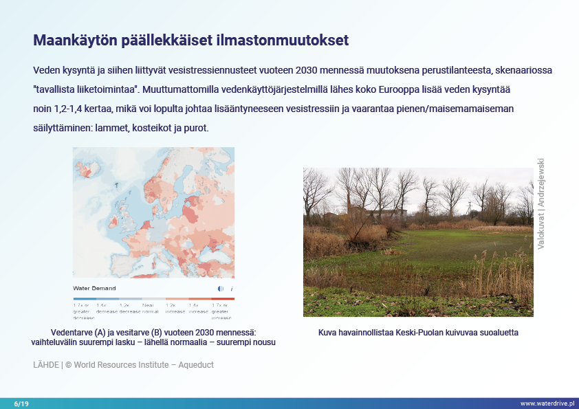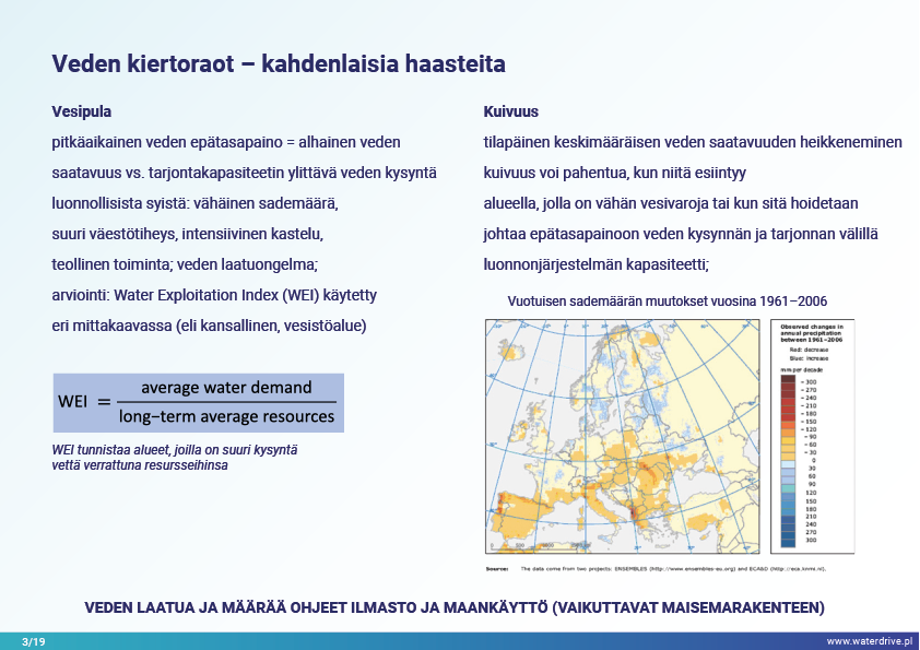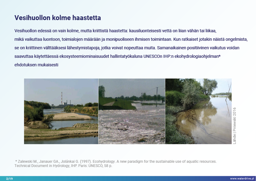 Vesihuollon alueella käsittelemme vain kolmea, mutta melko kriittistä haastetta – vettä on liian vähän, liikaa tai se on saastunutta. Nämä ongelmat liittyvät yleensä toisiinsa, joten yhden ratkaiseminen voi lopulta syventää toista (kuten tehokkaaseen veden ulosvirtaukseen perustuva tulvasuojelu kaupungeissa, mikä vaikuttaa UHI:hen ja pohjaveden laskuun). Veden puute tai ylijäämä syntyy myöhemmin vuodenaikojen sademäärän vaihteluiden, vedenjako-ongelmien ja käyttöintensiteetin seurauksena. Veden puute vaikuttaa maaperän rakenteeseen heikentäen sen läpäisemistä, laukaisee tuulieroosiota, heikentää vesivarastoina toimivia ekosysteemejä: jokia, järviä, lampia, kosteikkoja, metsiä ja lisää saasteiden keskittymistä vesistöihin. Veden ylivuoto aiheuttaa vesieroosiota, huuhtoutumista ja vesistöjä jokiin. Ilmaston vaihtelun ja maatalouden intensiivisemmän veden käytön myötä nämä prosessit todennäköisesti kiihtyvät seuraavina vuosikymmeninä.