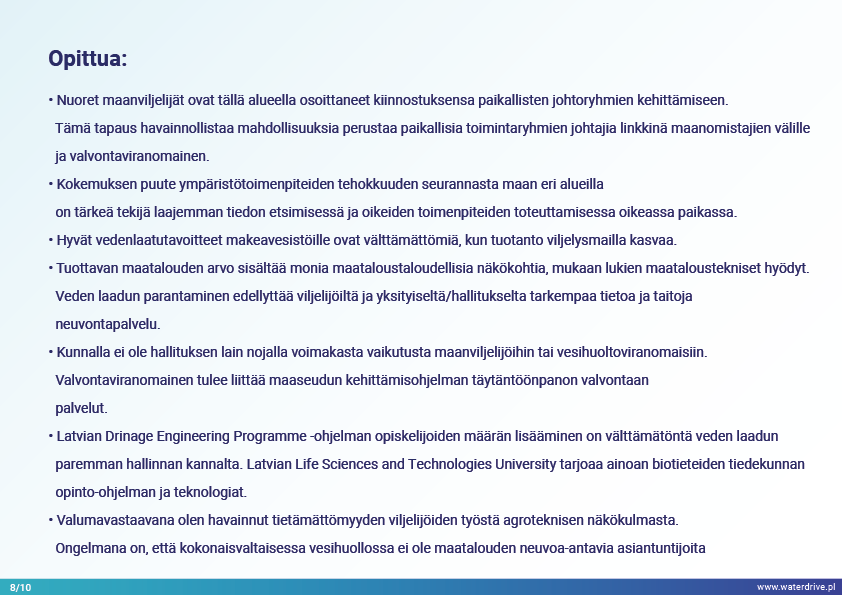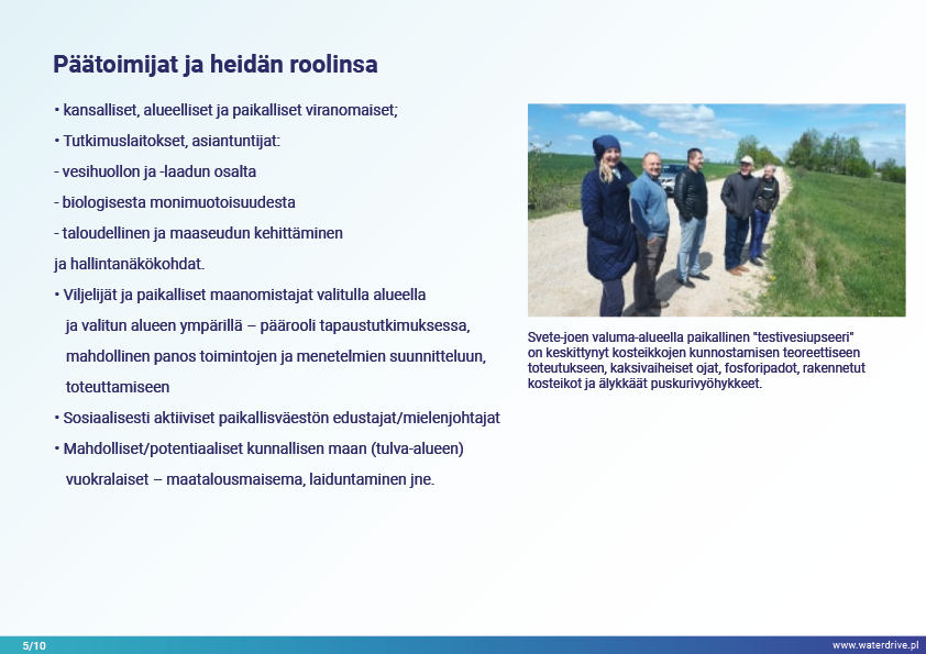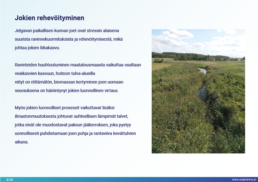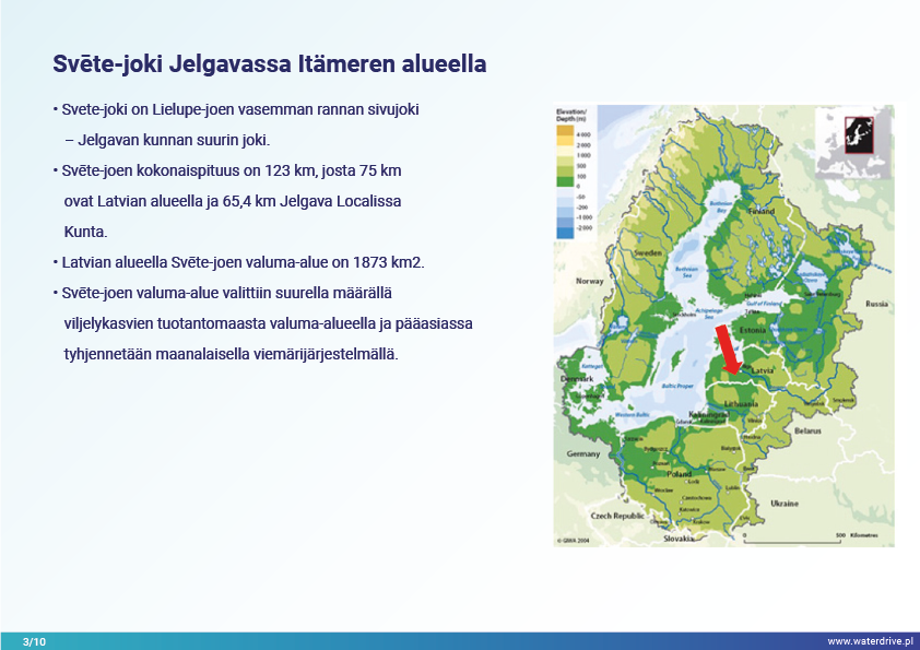 Jelgavan kunnan (Latvia) joet ovat stressaantuneita, ja niihin vaikuttavat korkeat ravinnekuormitukset ja rehevöityminen, mikä johtaa jokien liikakasvuun. Waterdrive-projektin aikana Svete-joen valuma-alueella paikallinen "testivesistövastaava" on keskittynyt kosteikkojen kunnostamisen teoreettiseen toteutukseen, kaksivaiheisiin ojiin, fosforipatoihin, rakennettuihin kosteikoihin ja älykkäisiin puskurivyöhykkeisiin.
