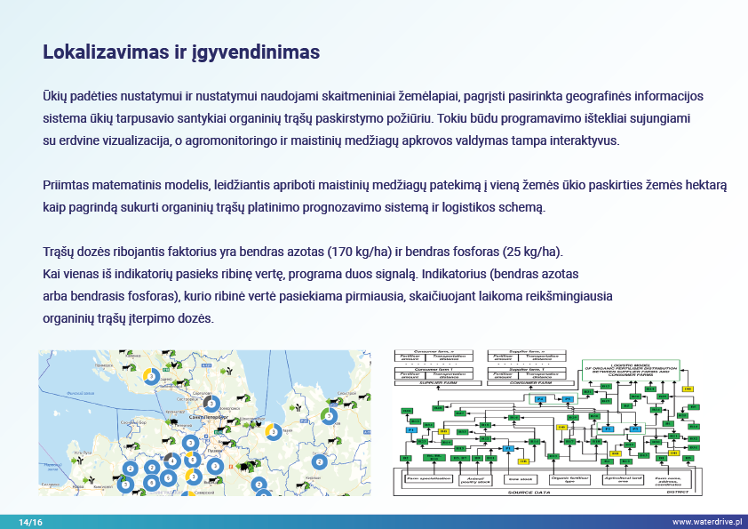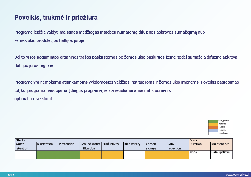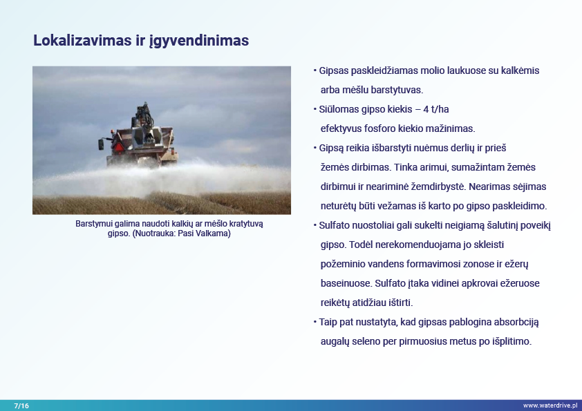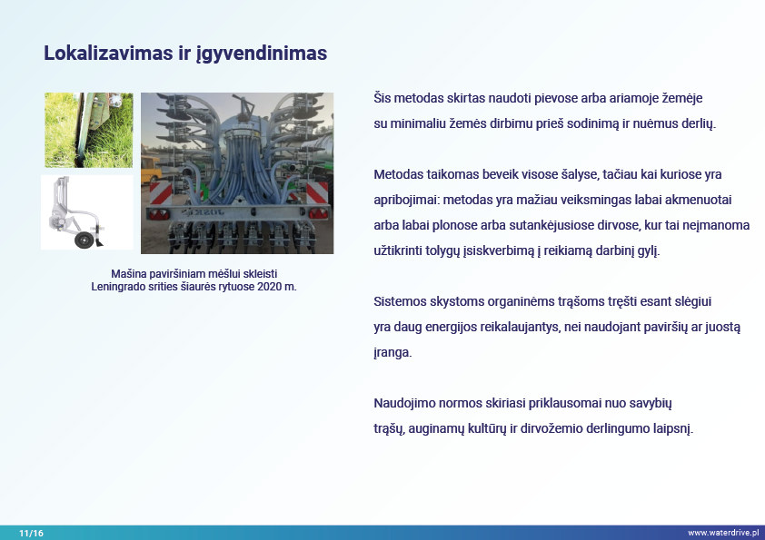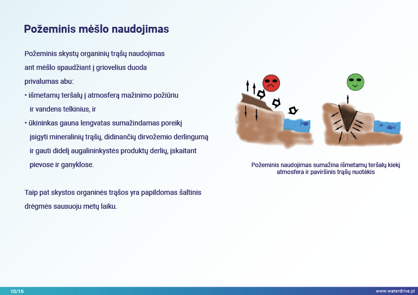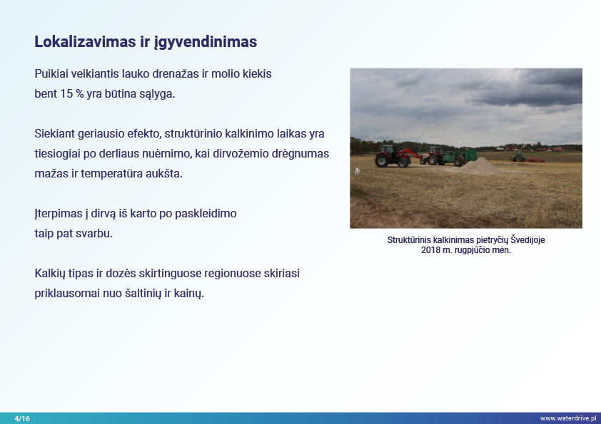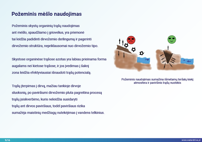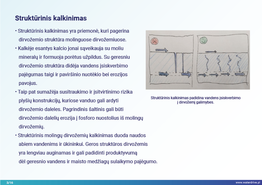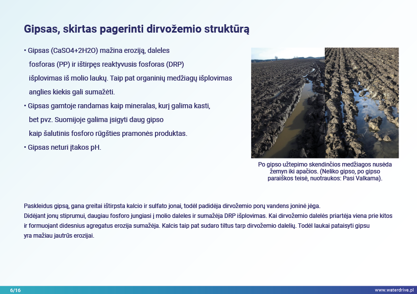 Waterdrive priemonių kataloge (https://www.slu.se/waterdrive) buvo pasirinktos dvi dirvožemio struktūros gerinimo priemonės: struktūrinis kalkinimas ir gipso įterpimas, mažinantis dirvožemio eroziją. Kitos dvi pateiktos priemonės – mėšlo naudojimas po žeme ir mėšlo paskleidimo baseino mastu stebėjimas – rodo tvaraus mėšlo paskleidimo potencialą, padedantį sumažinti vandens taršą.