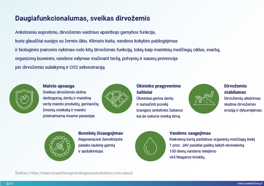 Klimato kaitos, prastėjančios vandens kokybės ir biologinės įvairovės nykimo akivaizdoje į dirvožemį žiūrime kaip į gyvą organizmą, turintį daugybę funkcijų. Be savo gamybinės funkcijos, glaudžiai susijusios su žemės ūkiu, dirvožemiu, be kita ko, dalyvauja potvynių ir sausrų prevencijoje, sulaikydamas vandenį dirvožemyje, dalyvauja maistinių medžiagų cirkuliacijoje, CO2 sekvestracijoje, vandens valyme mažinant taršą, organizmų buveinės.