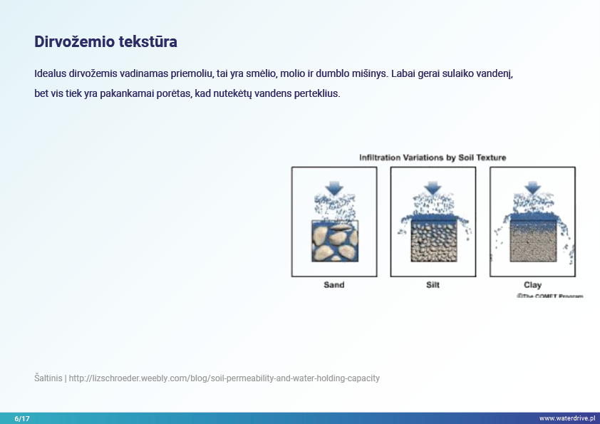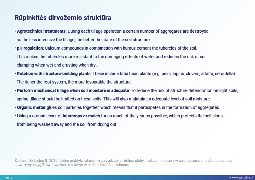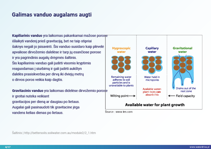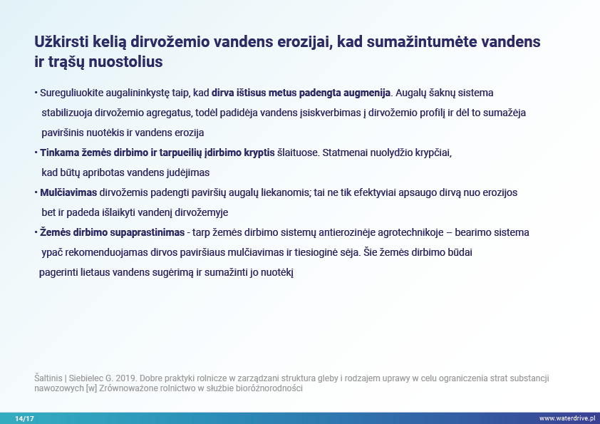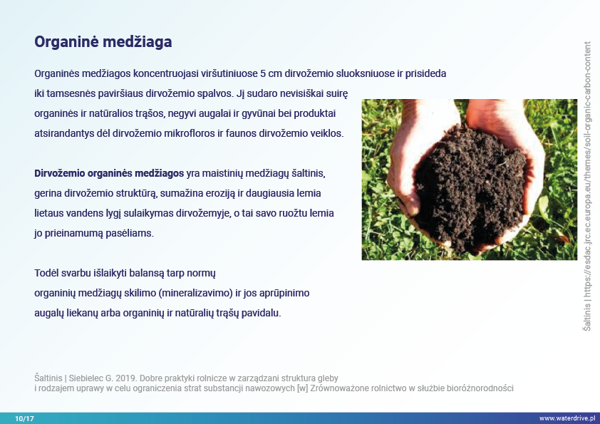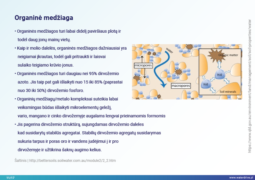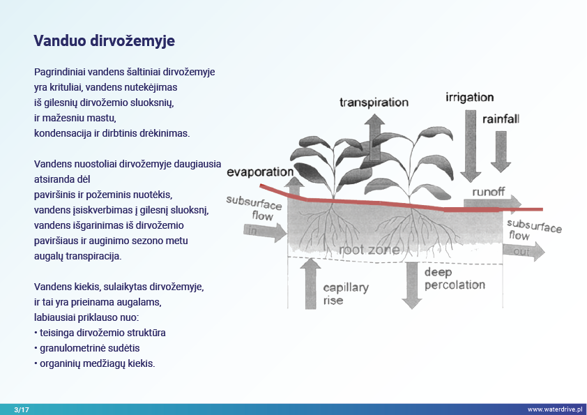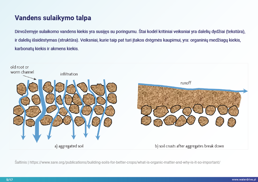Šiame pristatyme mes sutelkiame dėmesį į dirvožemio vaidmenį sulaikant vandenį ir taip užkertant kelią maistinių medžiagų praradimui. Mes parodome, kokia gera žemės ūkio praktika padeda rūpintis dirvožemio struktūra, didinti organinių medžiagų kiekį dirvožemyje ir riboti dirvožemio eroziją