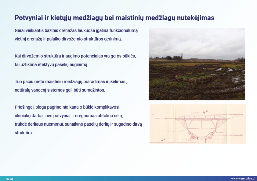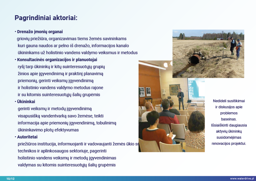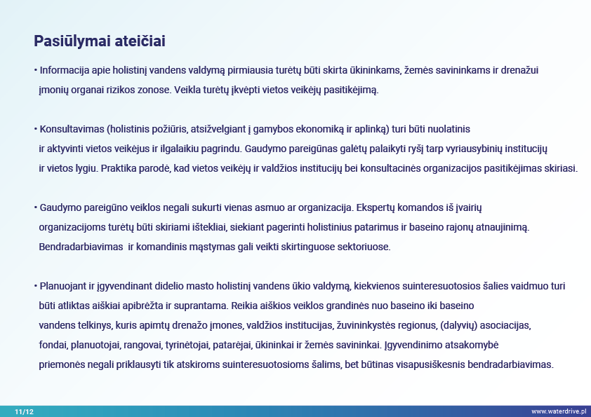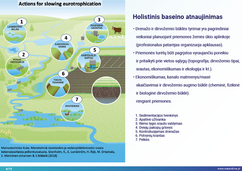 Holistinio vandens valdymo įgyvendinimas baseino mastu tikriausiai garantuoja geriausią įmanomą rezultatą tiek drenažui, tiek dirvožemio struktūrai gerinti, ir maistinių medžiagų nuostolių vandens telkiniams sumažinimą, atsižvelgiant į biologinę įvairovę, vandens kokybę ir žuvininkystę.