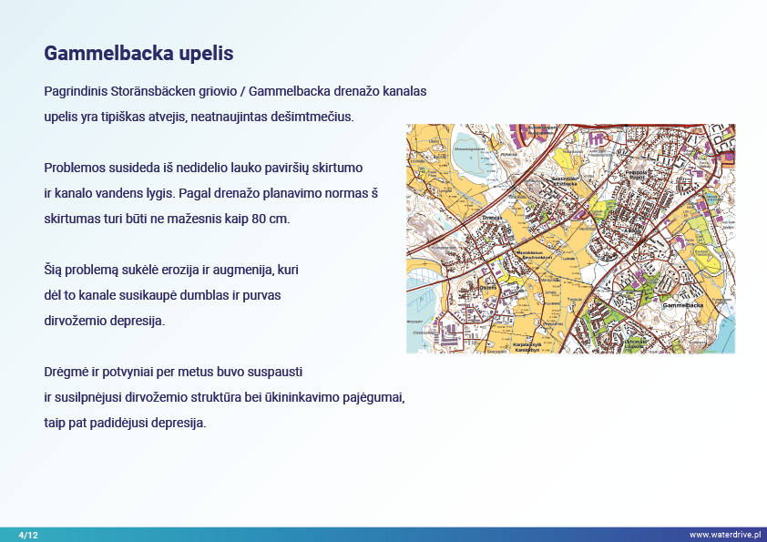 Pagrindinis Storänsbäcken griovio / Gammelbacka upelio (Suomija) drenažo kanalas yra tipiškas atvejis, neatnaujintas dešimtmečius. Bloga magistralinio kanalo būklė apsunkino ūkininkų darbus, nes potvyniai ir drėgnumas atitolino sėją, apsunkino derliaus nuėmimą, sunaikino pasėlių derlių, sugadino dirvožemio struktūrą.