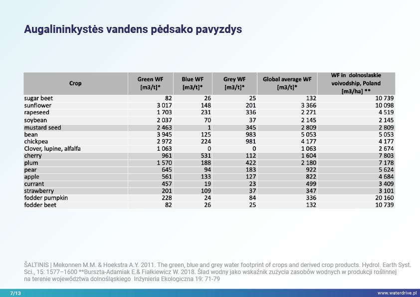 Pristatyme identifikuojame galimybes sumažinti augalininkystės vandens pėdsaką žaliuoju (lietaus vandens naudojimas), mėlynuoju (vanduo, paimamas iš paviršinio ir požeminio vandens drėkinimui) ir pilkojo vandens pėdsaku (vanduo, naudojamas žemės ūkio teršalams skiesti). Be to, buvo pasiūlytas būdas įtraukti žemės ūkio vandenį į ekonominius skaičiavimus, išplečiant tiesioginio pertekliaus sąskaitą, įtraukiant apskaičiuotas vandens sąnaudas.