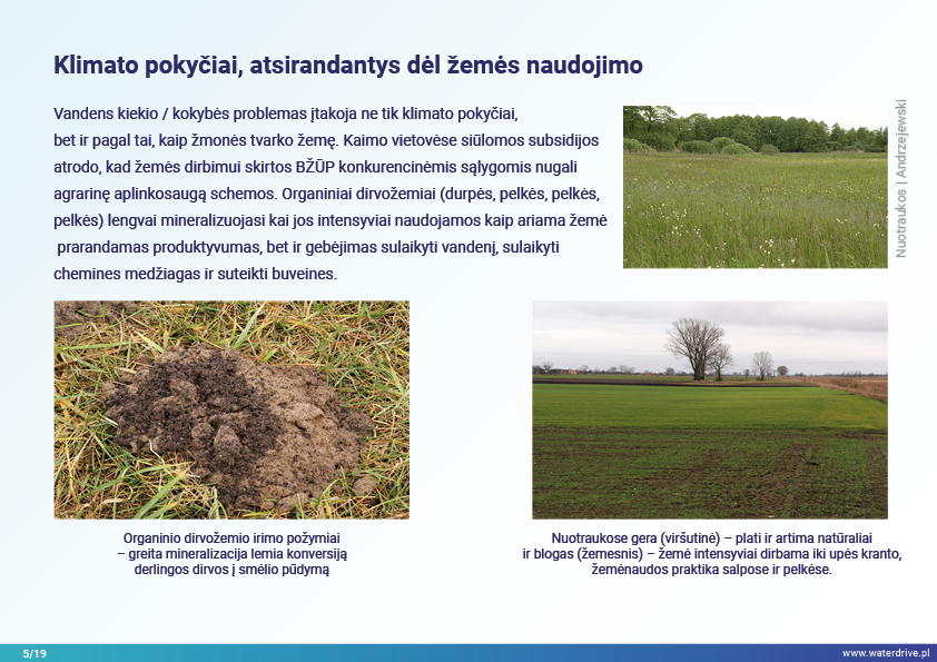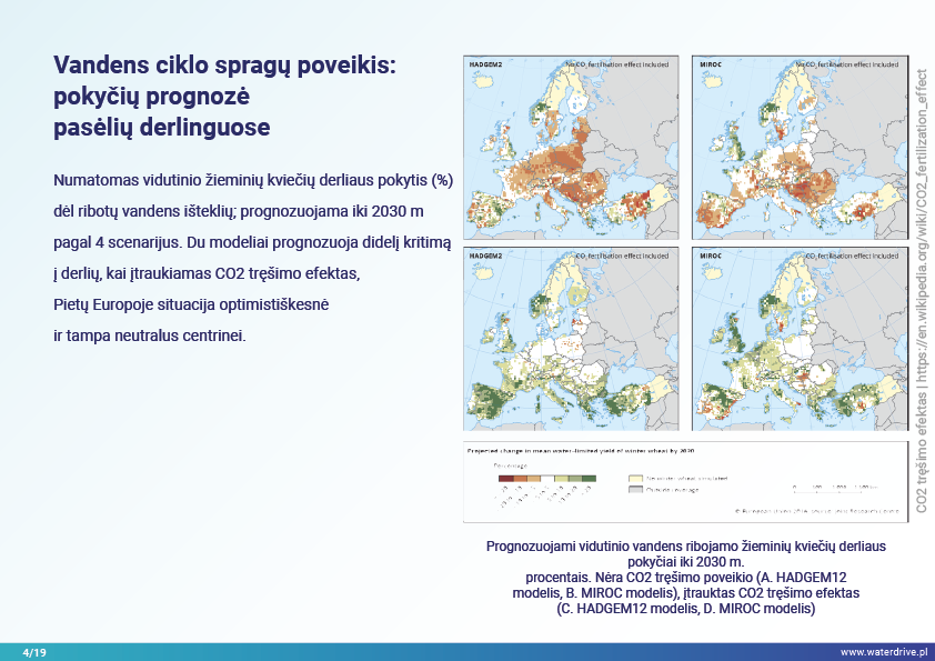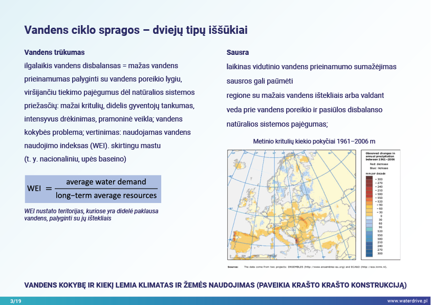 Vandentvarkos srityje susiduriame su tik trimis, bet gana kritiniais iššūkiais – vandens per mažai, per daug arba jis užterštas. Šios problemos dažniausiai yra tarpusavyje susijusios, todėl išsprendus vieną, galiausiai galima pagilinti kitą (pvz., apsauga nuo potvynių miestuose, pagrįsta efektyviu vandens nutekėjimu, kas prisideda prie UHI ir požeminio vandens lygio kritimo). Vandens trūkumas arba perteklius atsiranda vėliau dėl sezoninių kritulių pokyčių, vandens paskirstymo ir naudojimo intensyvumo problemų. Vandens trūkumas daro įtaką dirvožemio struktūrai, todėl jis tampa mažiau pralaidus, sukelia vėjo eroziją, blogina ekosistemas, veikiančias kaip vandens saugyklos: upes, ežerus, tvenkinius, pelkes, miškus ir didina taršos koncentraciją vandens telkiniuose. Vandens išsiliejimas sukelia vandens eroziją, išplovimo taršą, hidraulinį poveikį upėms. Didėjant klimato kaitai ir intensyvėjant vandens naudojimui žemės ūkyje, šie procesai artimiausiais dešimtmečiais greičiausiai sustiprės.