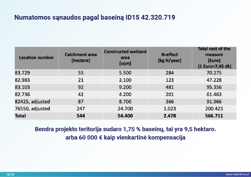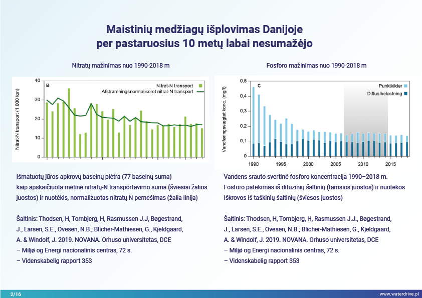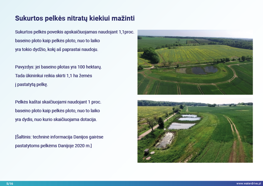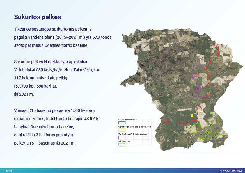Maistinių medžiagų nuotėkis per pastaruosius 10 metų Danijoje reikšmingai nesumažėjo, todėl investicijoms į dirbtinių šlapžemių statybą buvo teikiama pirmenybė kaip švelninimo priemonė. Šiuo tikslu buvo įsteigti baseino pareigūnai, sudaryti iš žemės ūkio konsultantų, kuriais pasitiki ūkininkai, ir aprūpinti duomenimis bei įrankiais, leidžiančiais planuoti sukurtas pelkes optimalioje baseino vietoje.