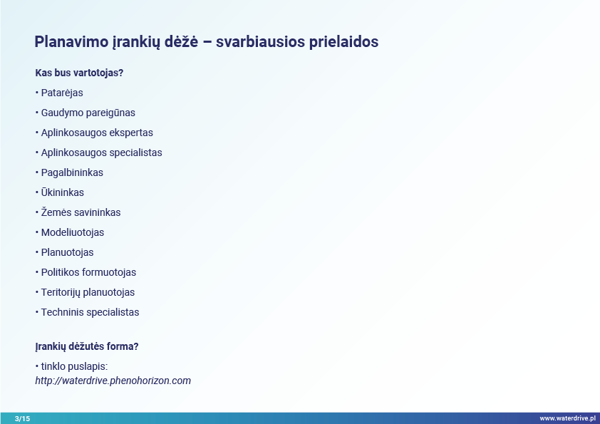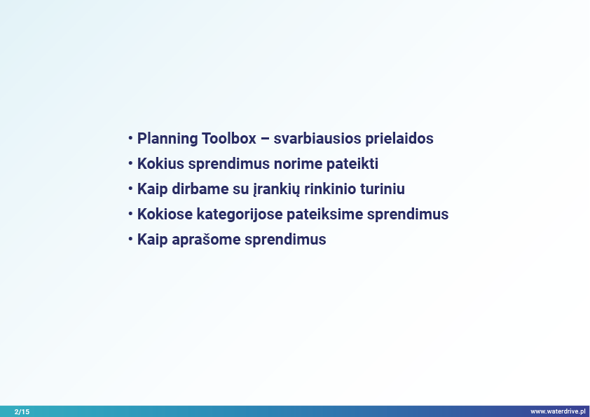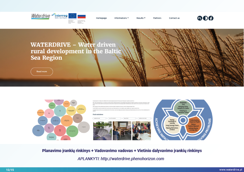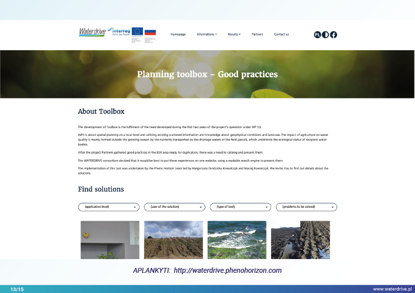 Planavimo įrankių rinkinys (https://waterdrive.cdr.gov.pl) yra laisvai prieinama svetainė, kurioje galima sužinoti apie gerą žemėnaudos planavimo praktiką, kokias priemones naudoti, kaip įsigilinti ir ką įtraukti į procesą, kad būtų pasiekti norimi aplinkosaugos rezultatai. tenkinant socialinius poreikius.