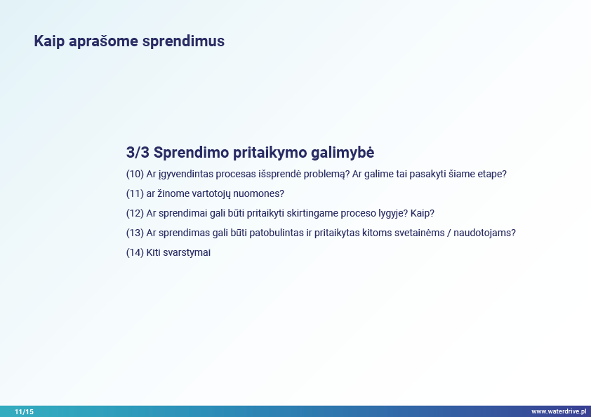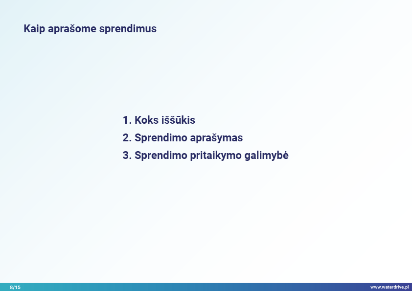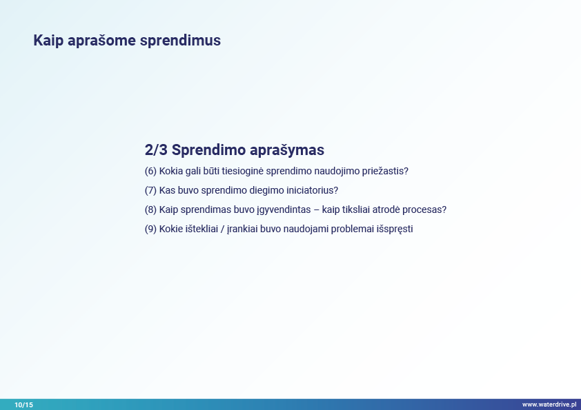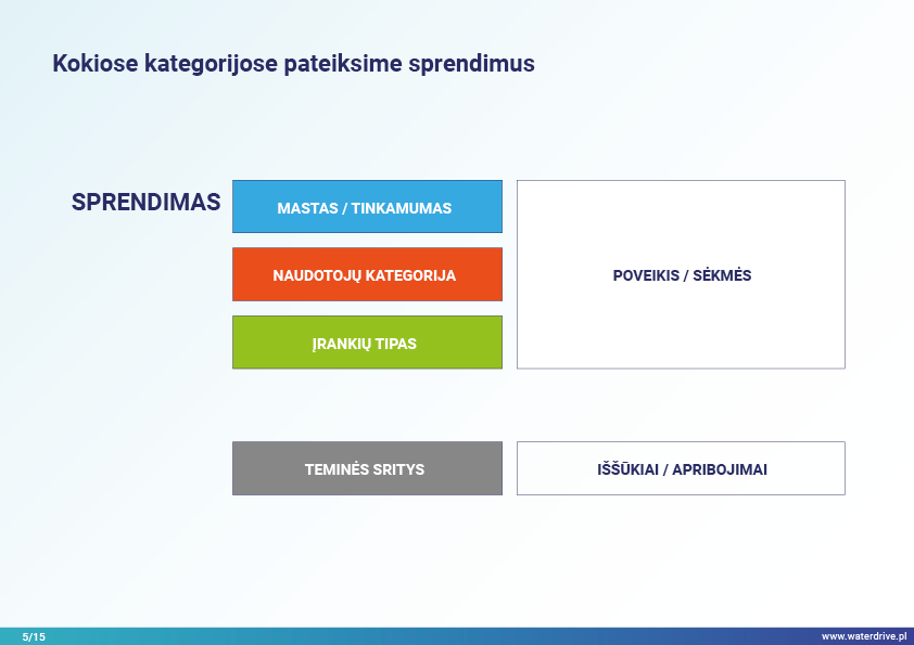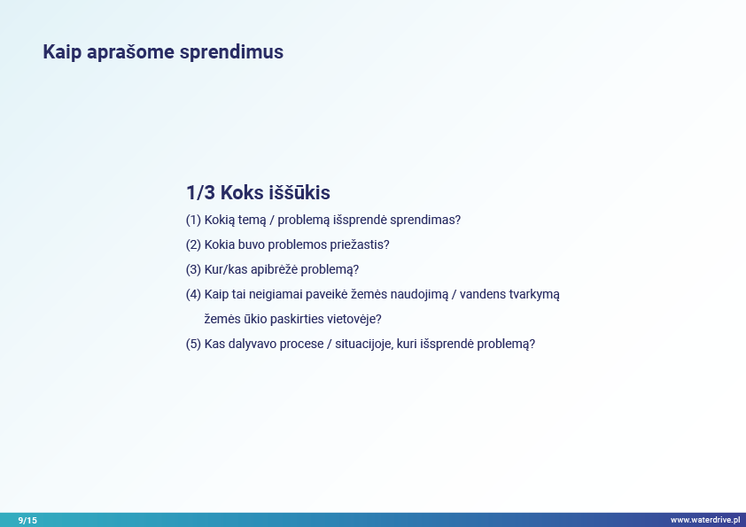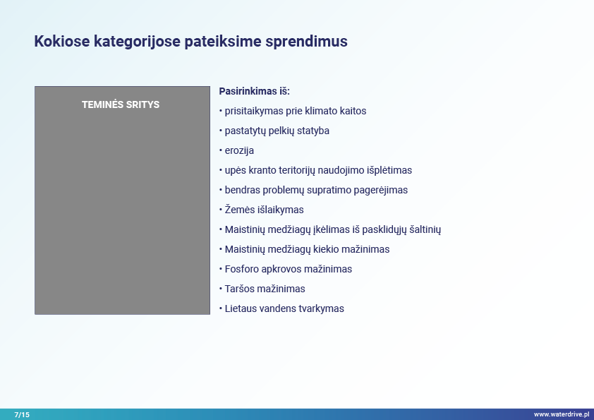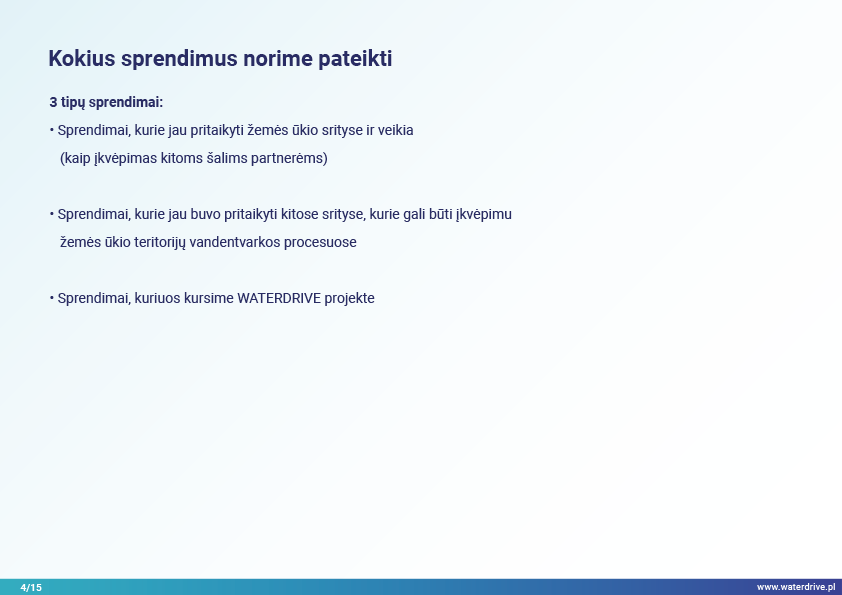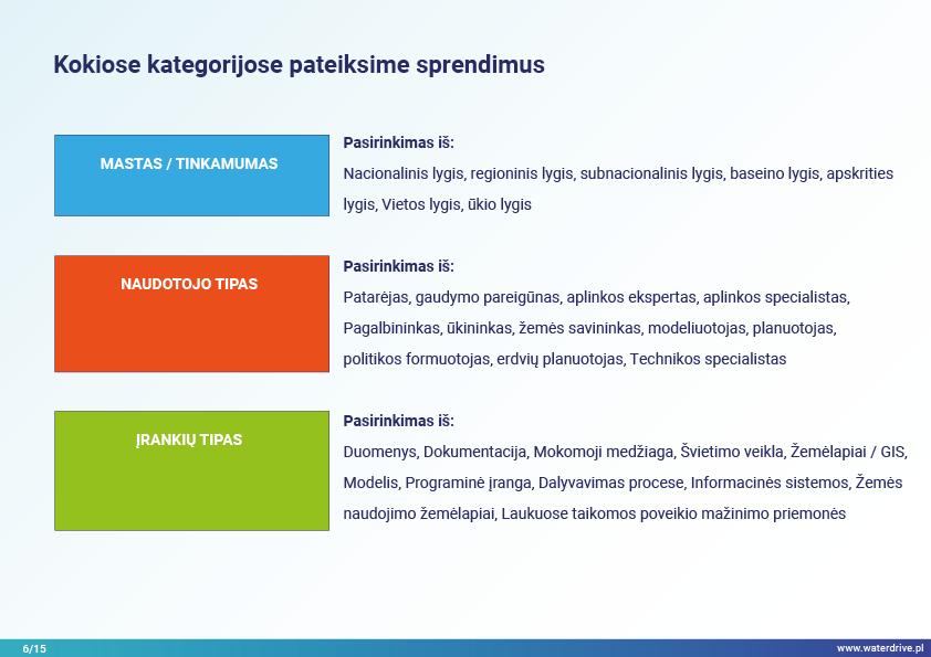 Sprendimai yra pagrįsti pavyzdžiais ir apima įvairias temines sritis žemės ūkio paskirties žemės teritorijų planavimo procese, siekiant numatytų aplinkosaugos rodiklių, susijusių su vandentvarka.