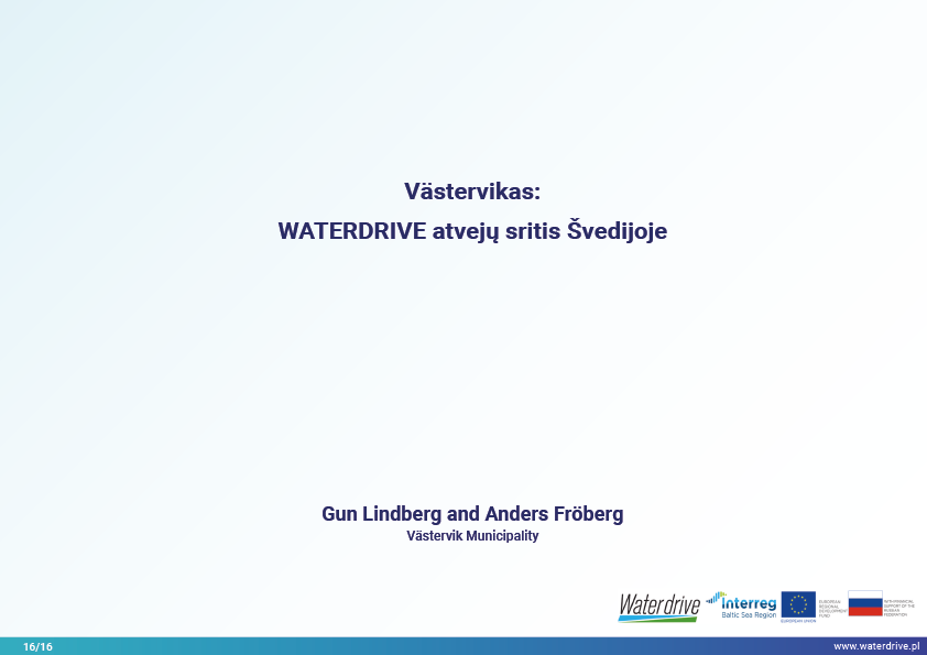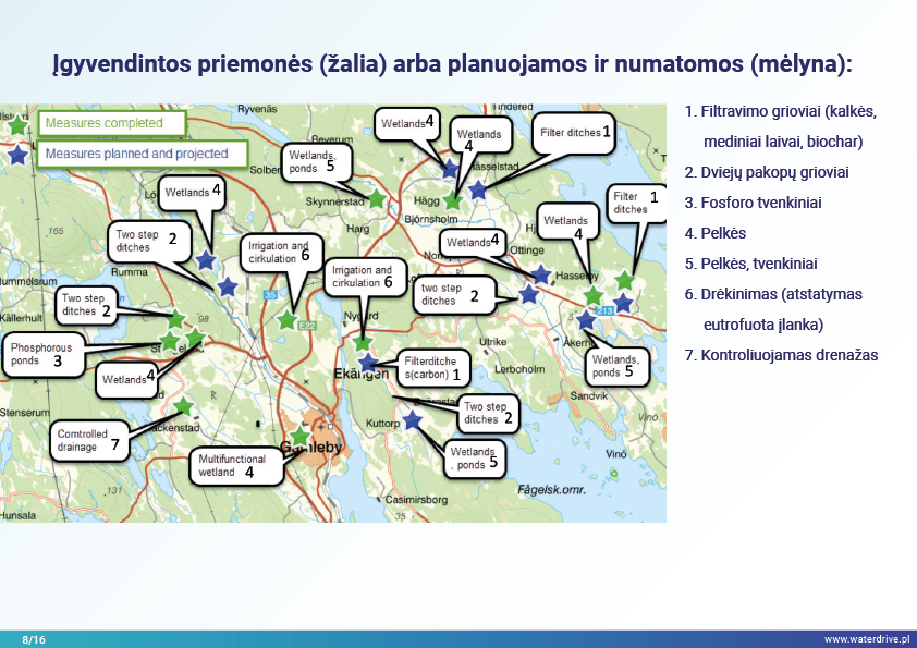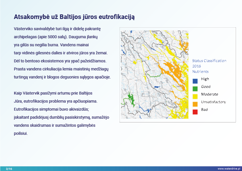 Västerviko (Švedija) savivaldybė Baltijos jūroje turi ilgą pakrantę ir didelį archipelagą. 2017 metais buvo patvirtintas Vietos veiksmų planas maistinių medžiagų nuostoliams mažinti, siekiant sumažinti Baltijos jūros eutrofikaciją. Plane nurodytos kelios mažinimo priemonės, kurios turėtų būti taikomos žemės ūkio paskirties vietovėse (pvz., struktūrinis kalkinimas, filtraciniai grioviai, dviejų pakopų grioviai, fosforo tvenkiniai, pelkės ir kontroliuojamas drenažas). Priemonės buvo suderintos su nustatyta problema, o jų vieta baseine parinkta kaip optimali.