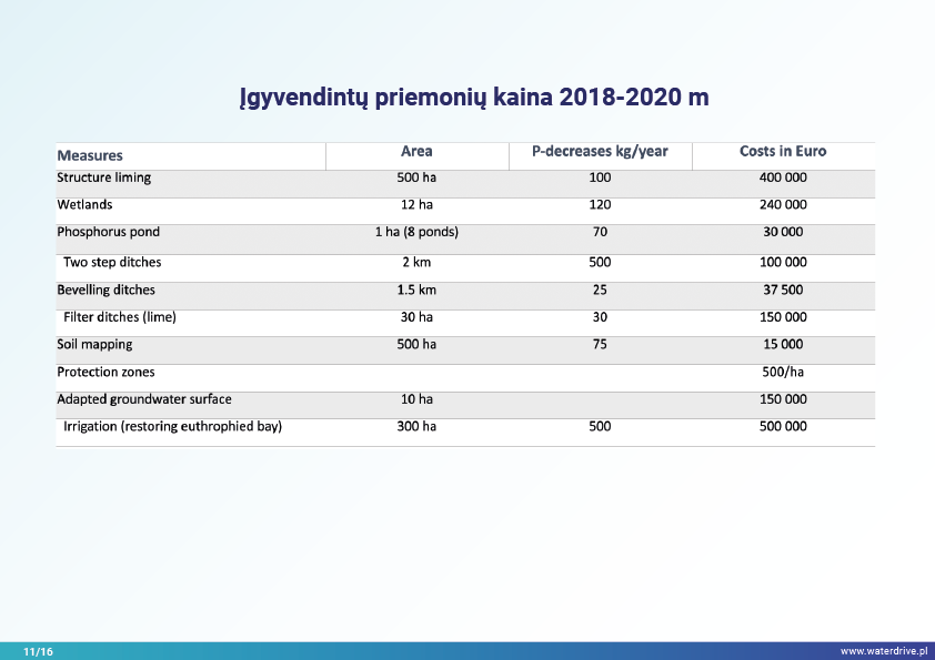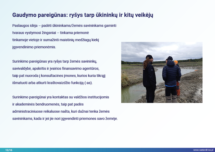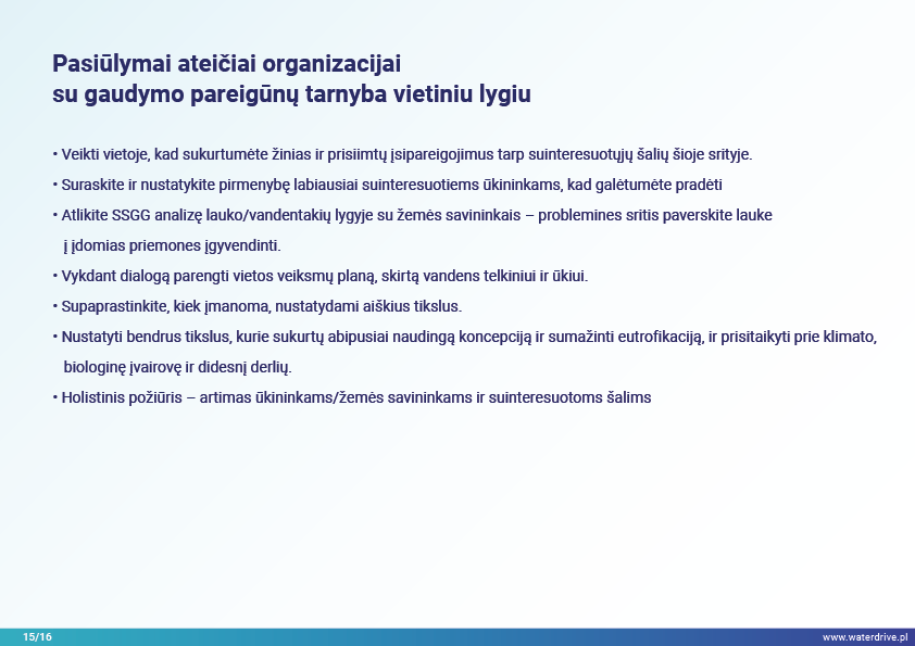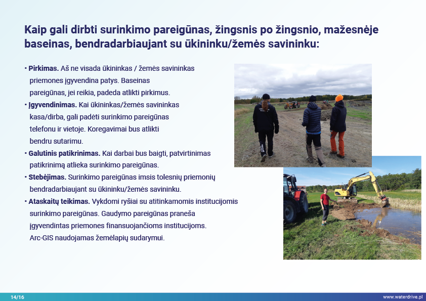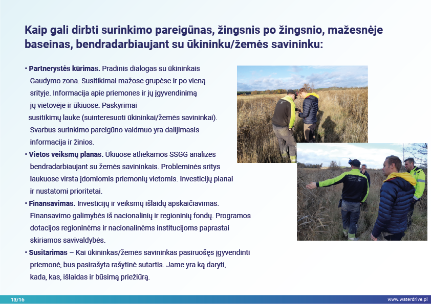 Idėja „Daryti reikiamus dalykus tinkamoje vietoje“ įkvepia visus „Waterdrive“ projekto partnerius. Pristatoma surinkimo pareigūno darbo patirtis, bendradarbiaujant su ūkininkais ir žemės savininkais įgyvendinant veiksmų planą.