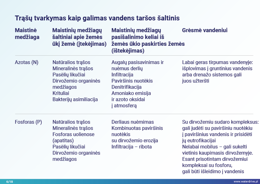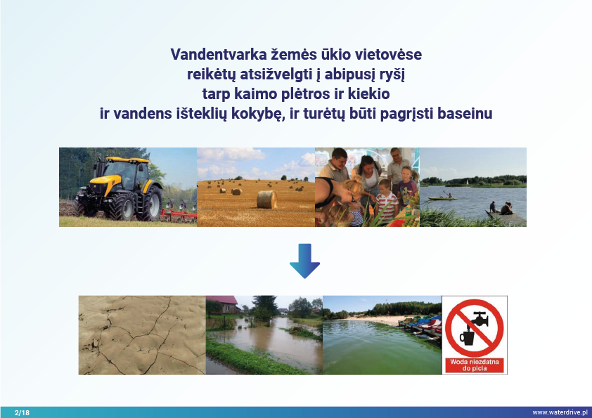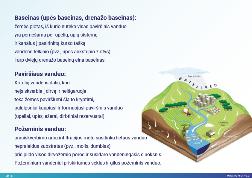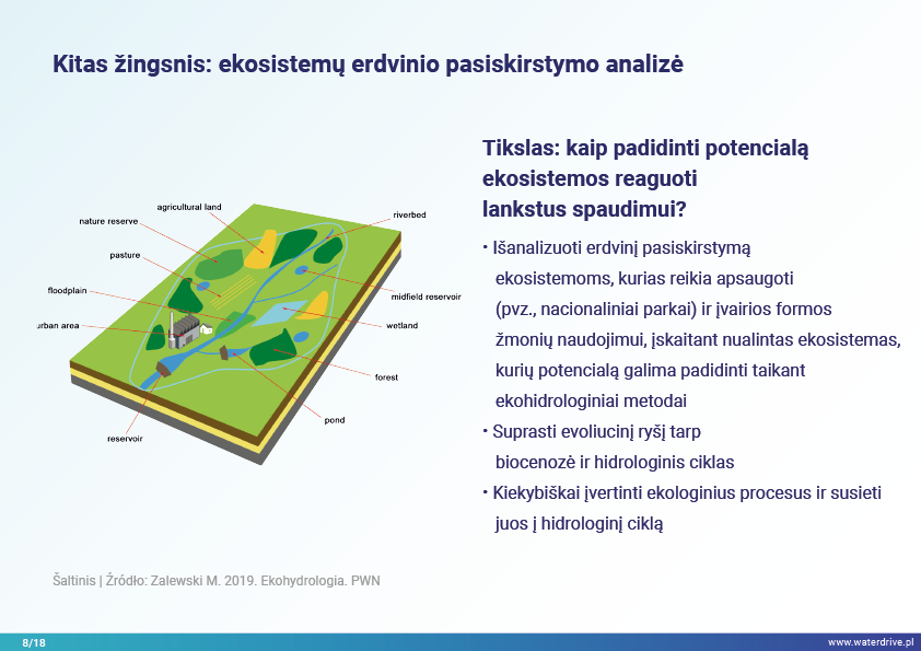 Šiame pristatyme paaiškiname baseino (upės baseino) sąvoką ir įvairius vandens ciklą sudarančius procesus. Taip pat pristatome tris vandentvarkos etapus, pagrįstus ekohidrologijos principais (Zalewski 2002), kuri prisiima „dvigubą reguliavimą“ – vandens ciklo reguliavimą formuojant biotą ir reguliuojant biotinius procesus ir atvirkščiai, biotos stiprinimą reguliuojant hidrologiją. Pateikta geroji praktika parodo, kaip galime daryti įtaką vandens sulaikymo didinimui ir maistinių medžiagų nuotėkio mažinimui kraštovaizdyje, dirvožemyje, drenažo sistemoje, paviršinio vandens ir sekliojo gruntinio vandens lygiuose. Tai kvietimas daugiau pristatymų!