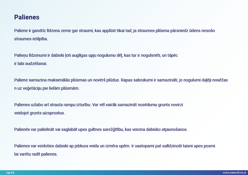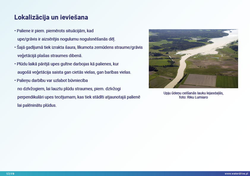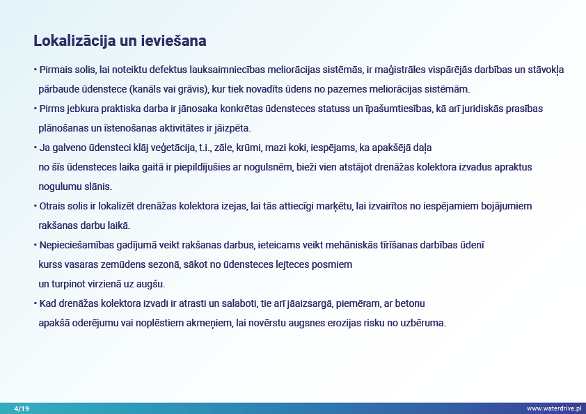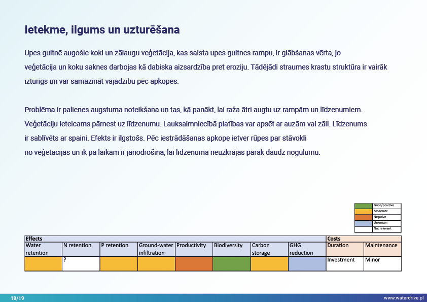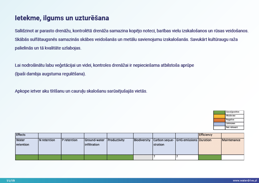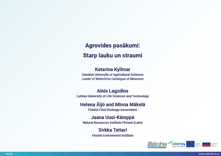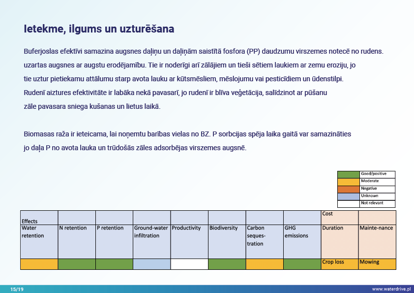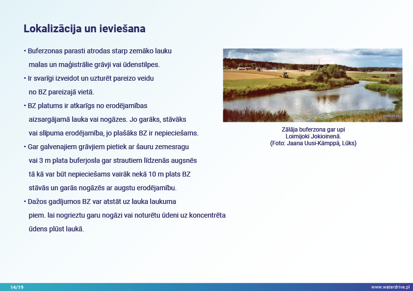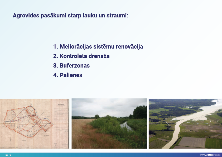 Vēl viena agrovides pasākumu grupa, kas sniegta Waterdrive pasākumu katalogā (https://www.slu.se/waterdrive), ir pasākumi zemes un ūdens saskarnē. Pirmie divi attiecas uz drenāžas sistēmas darbību: meliorācijas sistēmu atjaunošana un kontrolēta drenāžas sistēma, kas ļauj kontrolēt ūdens plūsmu un samazināt barības vielu izskalošanos. Buferjoslu un palieņu izmantošana ir vairāku labumu pasākums, piem. saglabā nogulsnes, barības vielas un citus piesārņotājus un uzlabo bioloģisko daudzveidību.