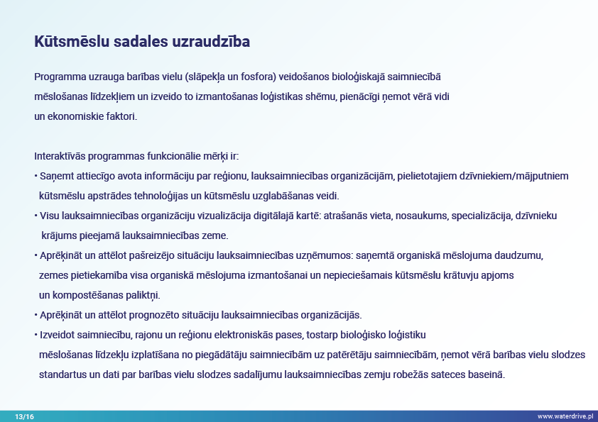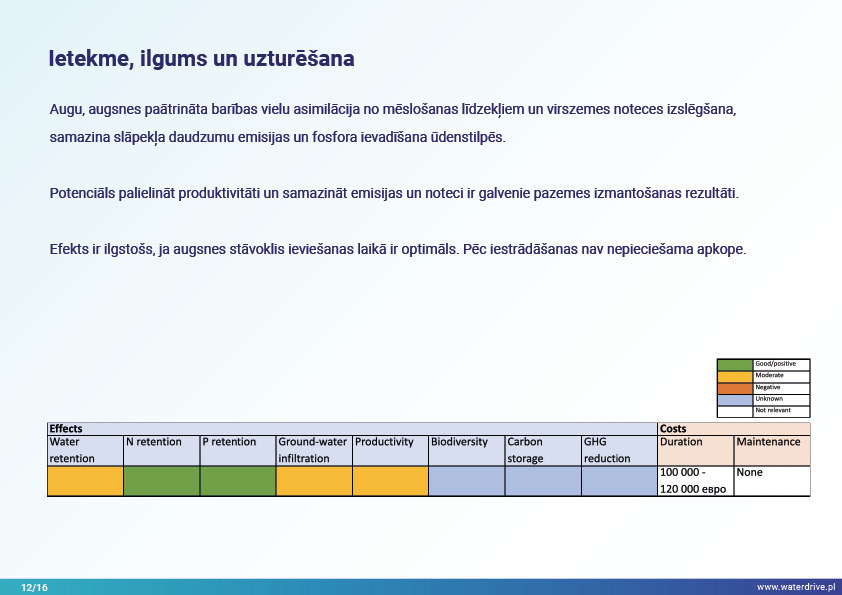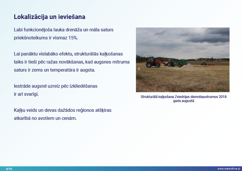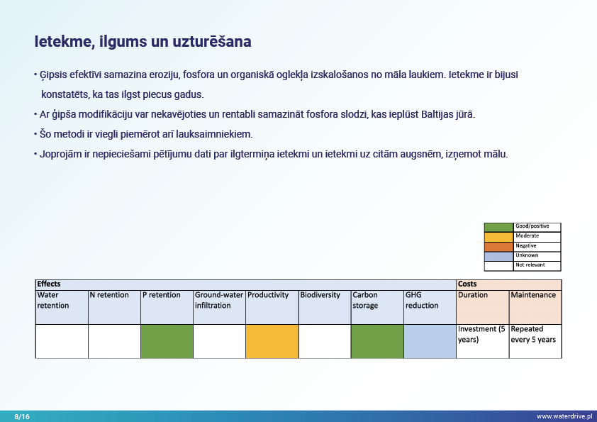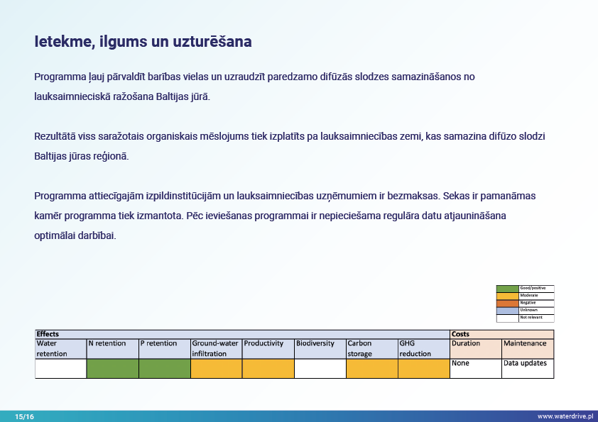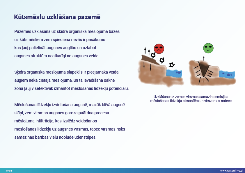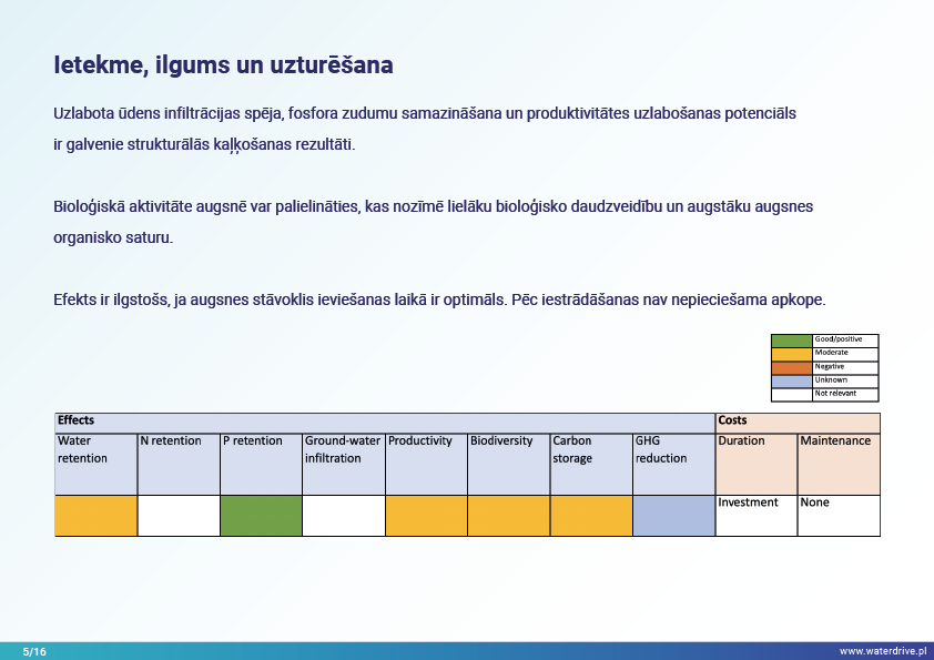 Waterdrive pasākumu katalogā (https://www.slu.se/waterdrive) augsnes struktūras uzlabošanai tika izvēlēti divi pasākumi: strukturālā kaļķošana un ģipša uzklāšana, kas samazina augsnes eroziju. Nākamie divi iesniegtie pasākumi, kūtsmēslu izmantošana pazemē un kūtsmēslu lietošanas uzraudzība sateces baseina mērogā, norāda uz ilgtspējīgas kūtsmēslu lietošanas potenciālu, lai palīdzētu samazināt ūdens piesārņojumu.
