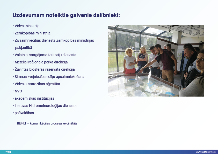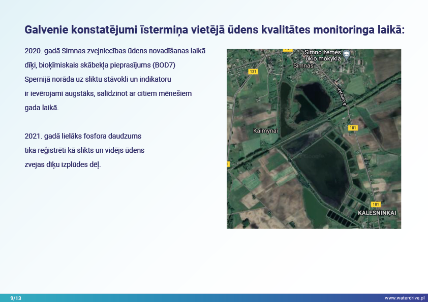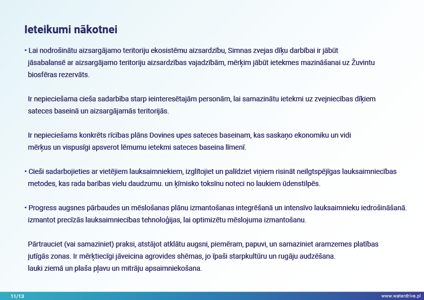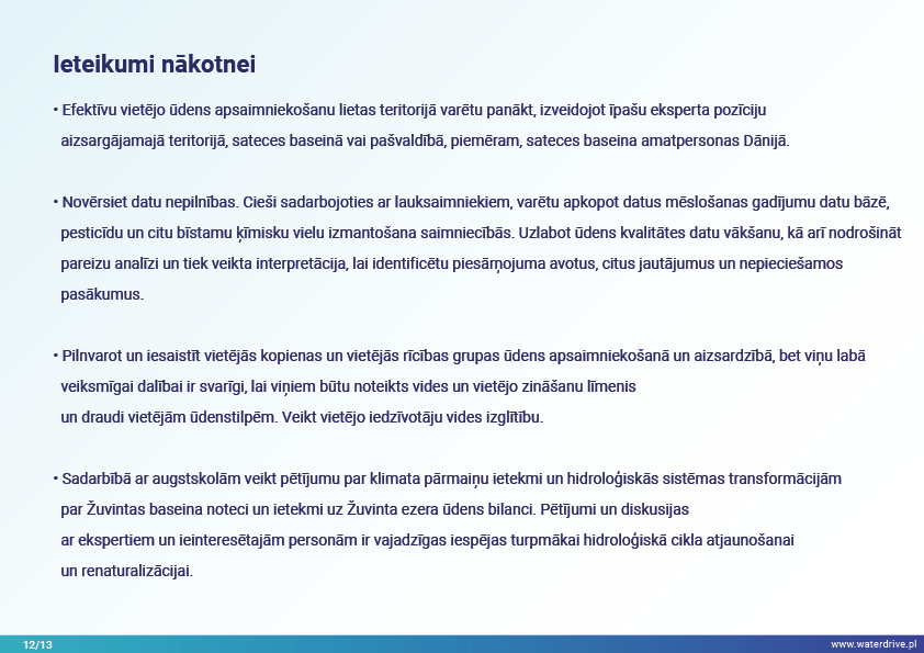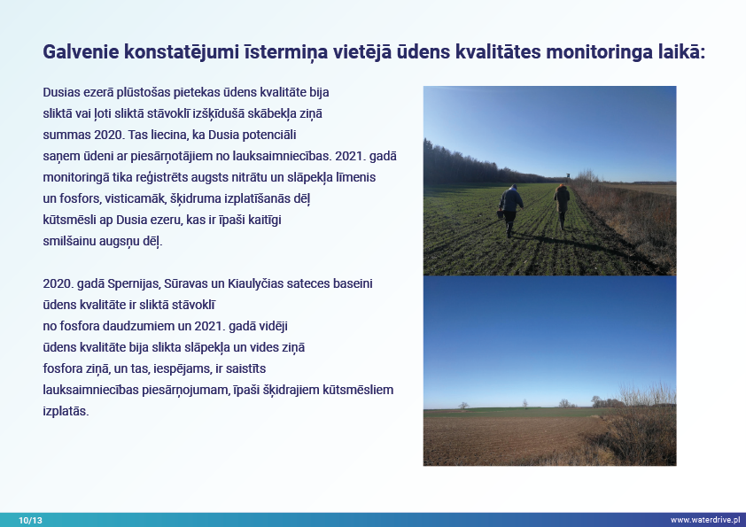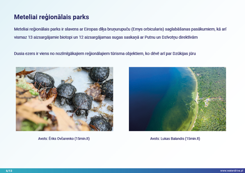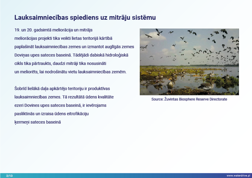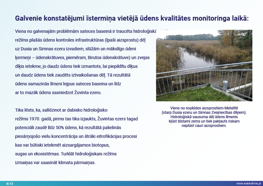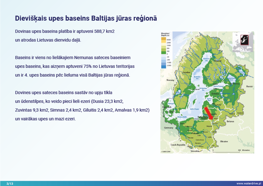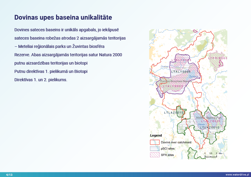 Dovines sateces baseins (Lietuva) ir unikāla teritorija, jo sateces baseina robežās atrodas 2 aizsargājamās teritorijas – Meteliai reģionālais parks un Žuvintas biosfēras rezervāts. 19. un 20. gadsimtā lietas teritorijā tika veikti meliorācijas un mitrāju meliorācijas projekti, lai paplašinātu lauksaimniecības zemes. Īstermiņa lokālā ūdens kvalitātes monitoringa analīze cita starpā norāda uz zivju dīķu ietekmi uz ūdens kvalitāti. Mēs arī iepazīstinām ar pieredzi, kas gūta vietējās sadarbības uzsākšanas posmā.