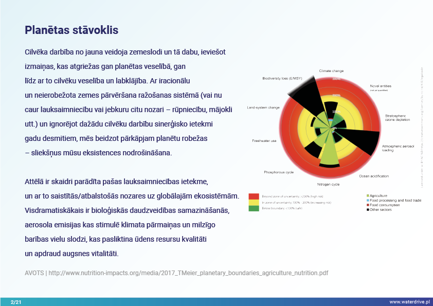 Cilvēka darbība pārveidoja zemeslodi un tās dabu, ieviešot izmaiņas, kas atgriežas gan planētas veselībai, gan līdz ar to arī cilvēku veselībai un labklājībai. Neracionāli un neierobežoti pārvēršot zemi ražošanas sistēmā (ar lauksaimniecību vai jebkuru citu nozari – rūpniecību, mājokli utt.) un ignorējot dažādu cilvēku darbību sinerģisko ietekmi gadu desmitiem, mēs beidzot pārkāpjam planētas robežas – sliekšņus, kas nodrošina mūsu eksistenci.
